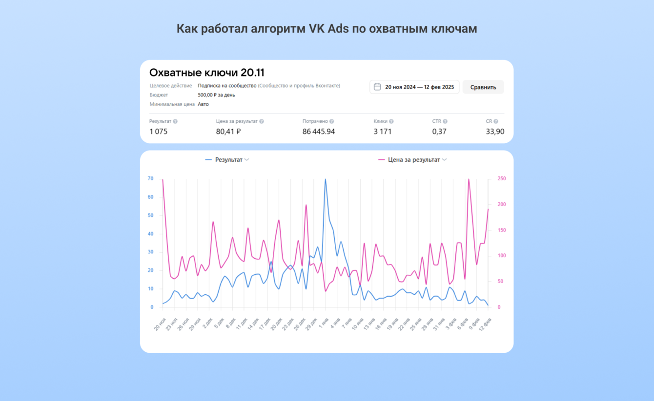 Обратите внимание: свою роль сыграли «подковерные игры» алгоритмов VK ADS. В начале нового года ключевая настройка «Расширить аудиторию» стала приносить дорогие результаты и до сих пор не пришла в норму.