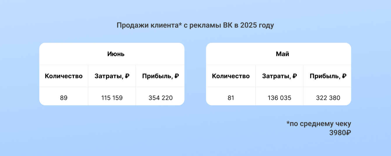 Оборот бизнеса растет. Если сравнивать июнь 2024 и 2025 годов, то выручка компании увеличилась на 87%. Не можем сказать, какая процентная часть приходится на продвижение в ВК из-за конфиденциальности. Зато можем раскрыть такой факт: благодаря рекламе для цеха СПб наняли третьего водителя и обеспечили его постоянной загрузкой.