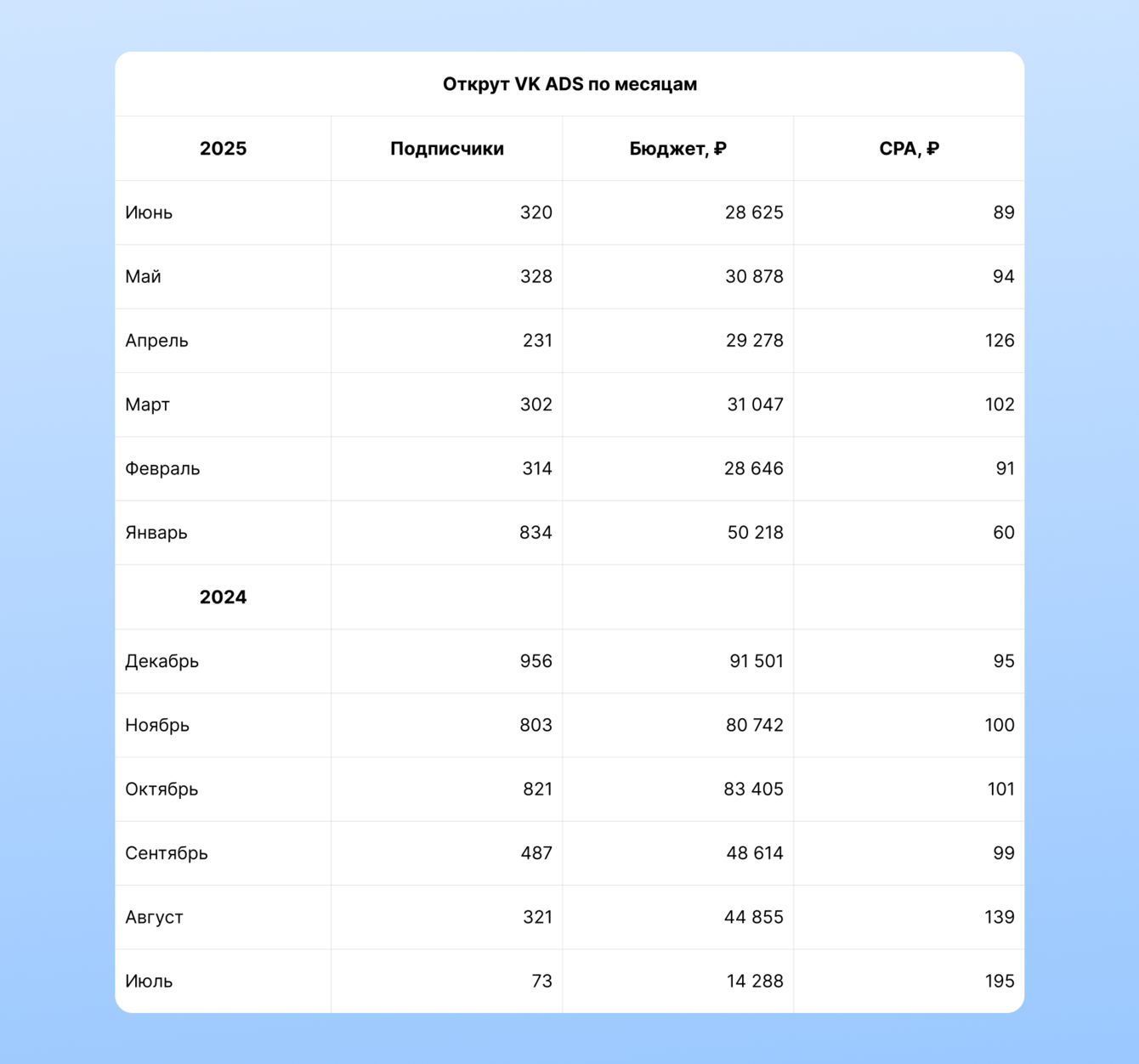 Мы закрыли запрос клиента: снизили стоимость подписчика до 100 рублей. По ходу работы наши специалисты неоднократно встречались с выгоранием связок и багами платформы — и всегда находили новые решения.