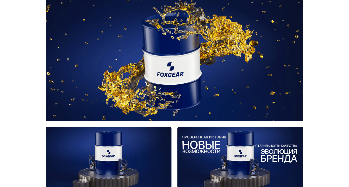 Рендеринг 3D-моделей канистры и бочки FOXGEAR в сочетании с маслом и постаментом из шестеренок. Финальный этап перед интеграцией в видео.