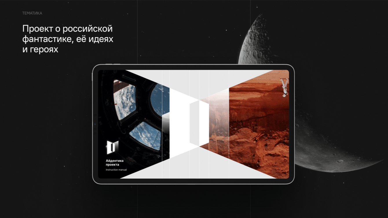 Мы создали комплексную айдентику, которая метафорично обыгрывает тему проекта, связанную с миром научной фантастики. А недавно проект попал в шорт-лист категории «Культурные проекты» премии Рунета.