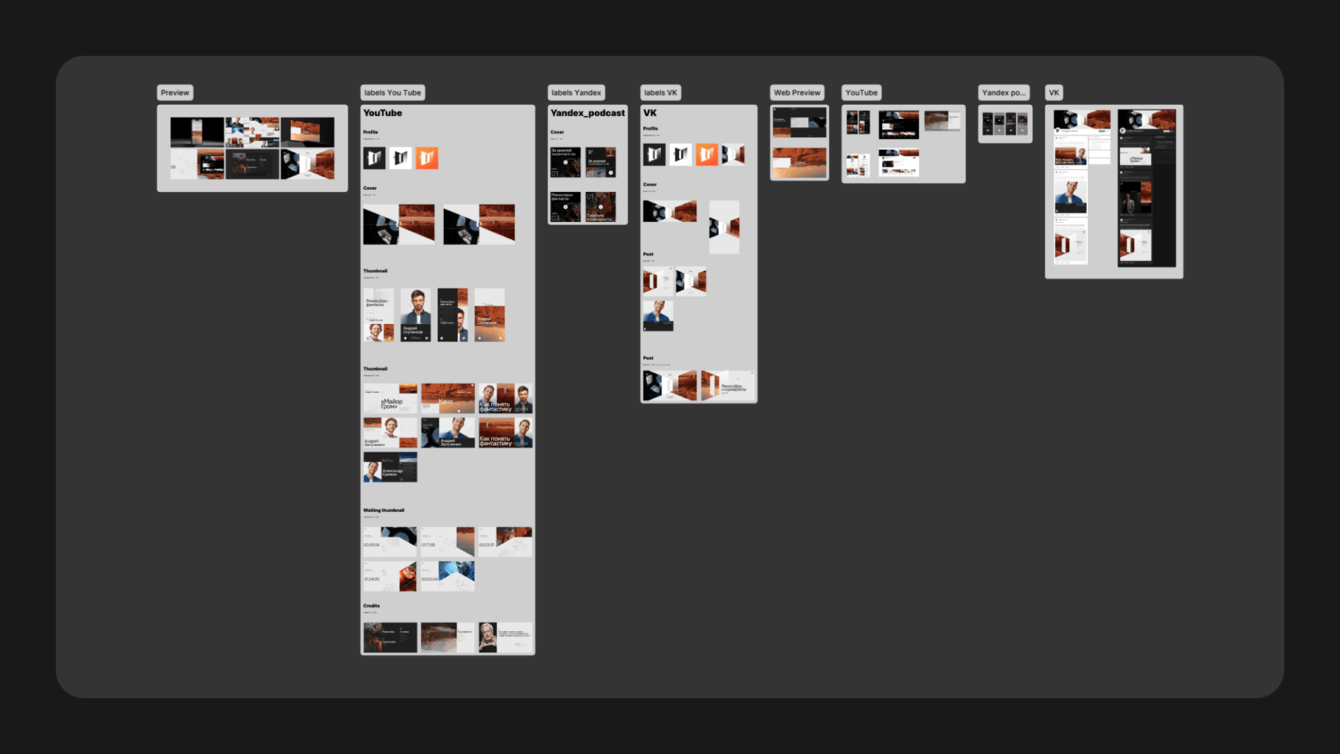 Для проекта «За ширмой тысячного ли» мы создали развёрнутый диджитал-гайдлайн, который описывает правила создания макетов для разных соцсетей — это YouTube, VK, Яндекс подкасты.