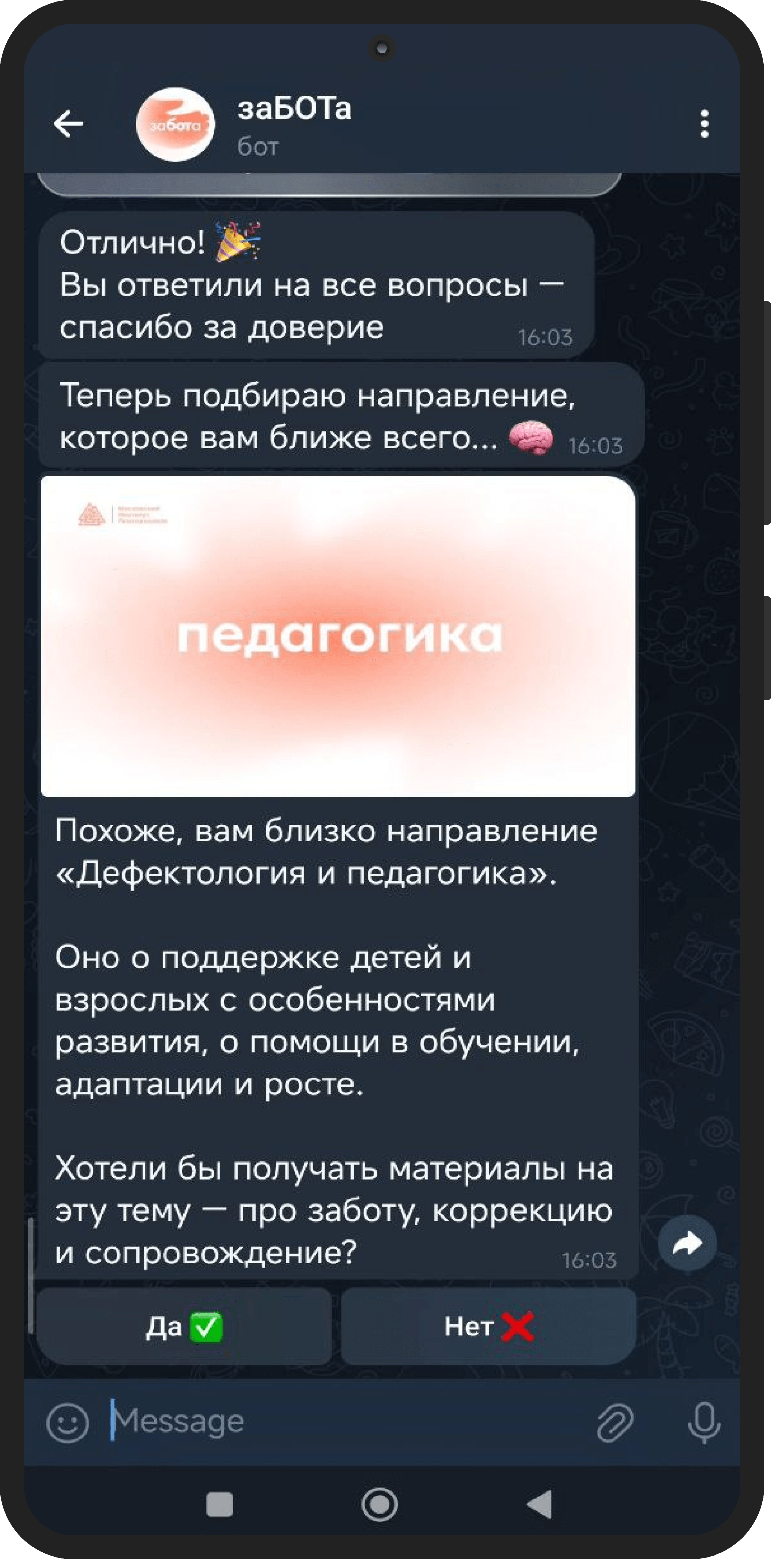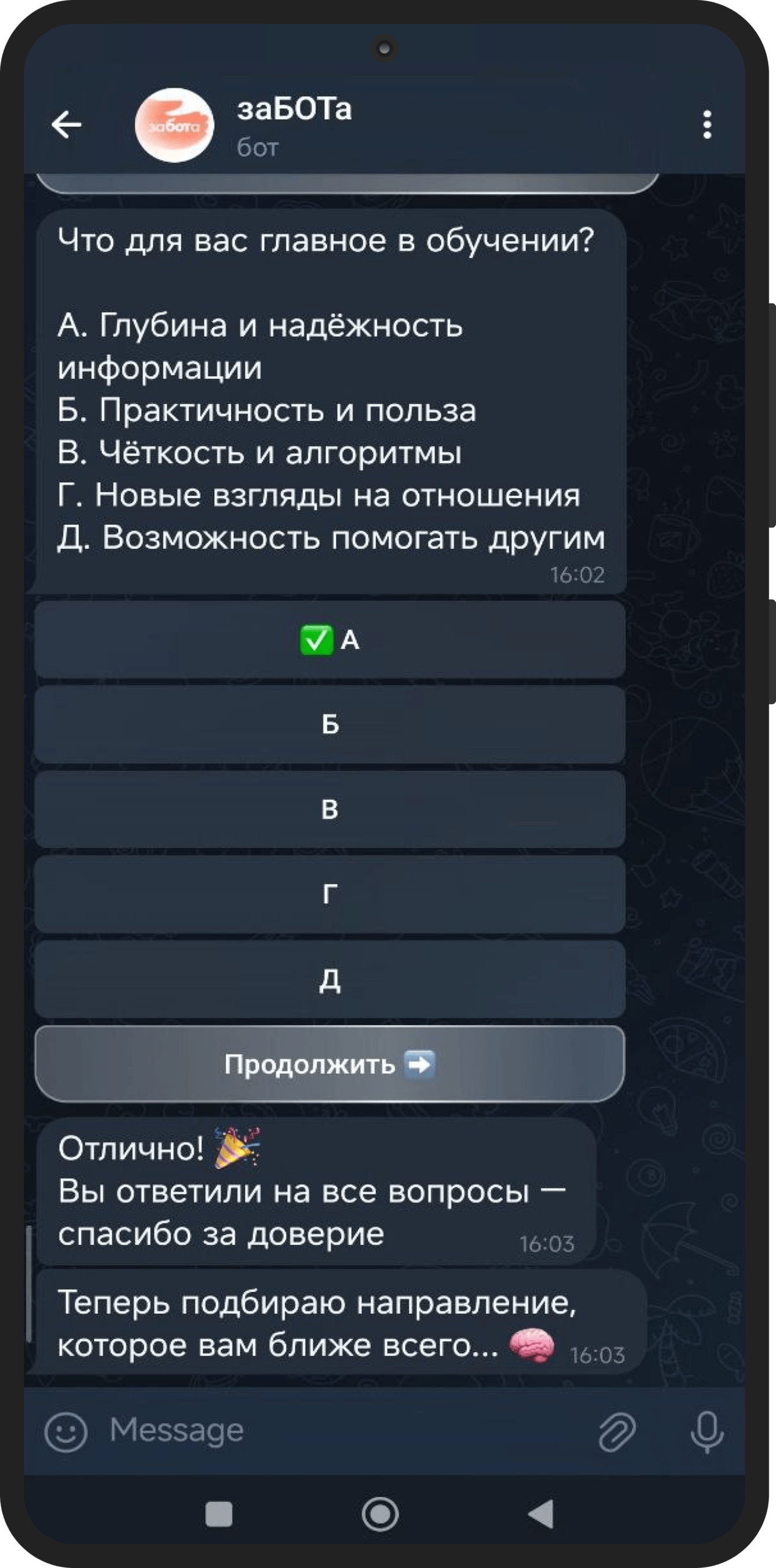 Бот задаёт 5 вопросов о привычках, интересах и формате обучения. Варианты подобраны так, чтобы по ответам можно было понять, что ближе человеку: психология, коучинг, педагогика, помощь другим или отношения. Система накапливает баллы и предлагает направление, которое пользователь может подтвердить или изменить вручную.