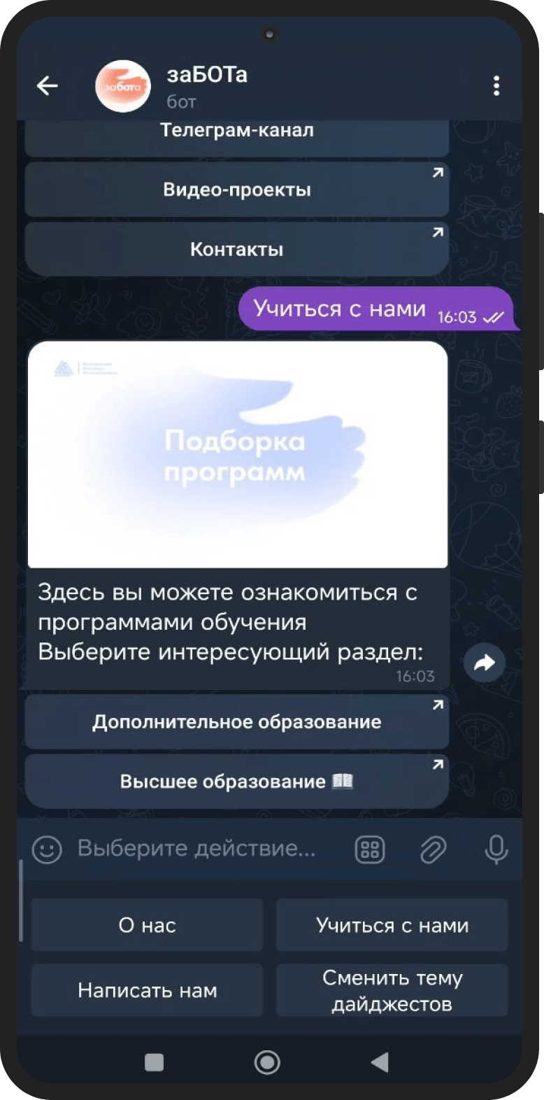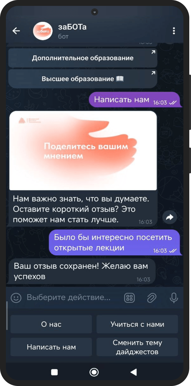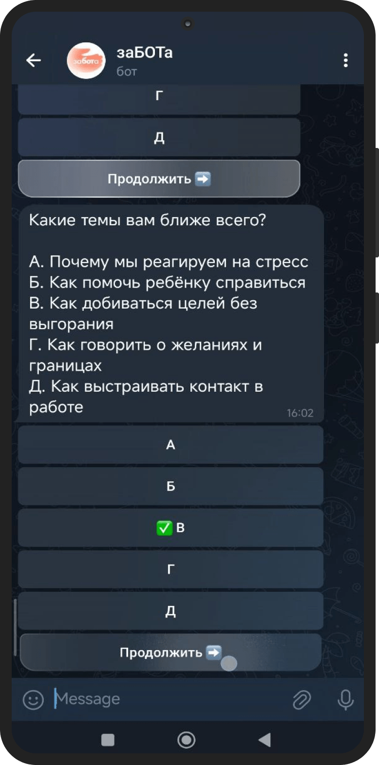 Работа с МИП — пример продуктивного партнёрства. Клиент активно участвовал в проекте, вносил предложения, помогал уточнять логику сегментации и контентную часть. Благодаря такому взаимодействию «заБОТа» получилась не просто функциональной, а по-настоящему живой. Проект ещё будет развиваться, и мы с нетерпением ждём первых отзывов пользователей.