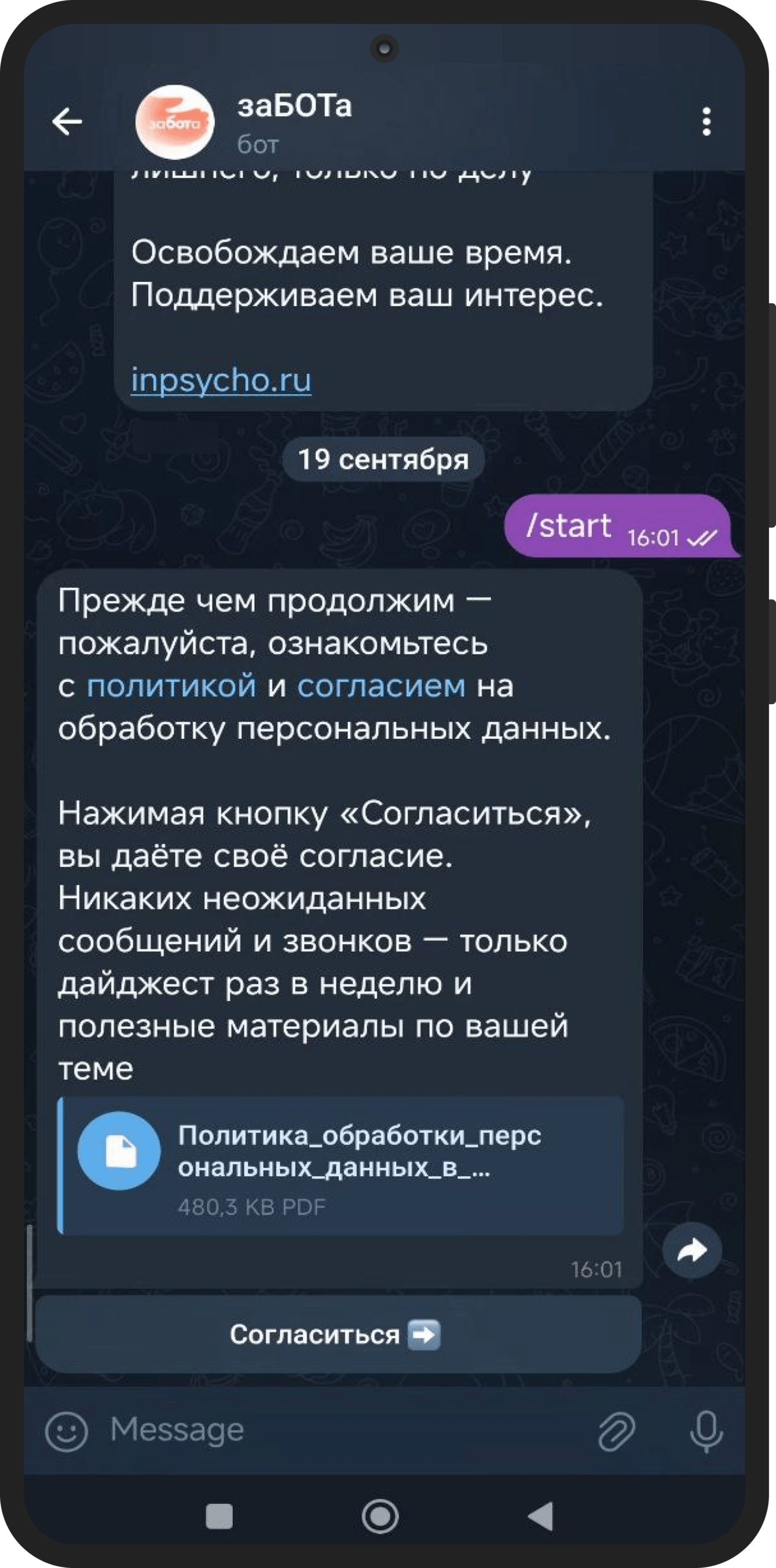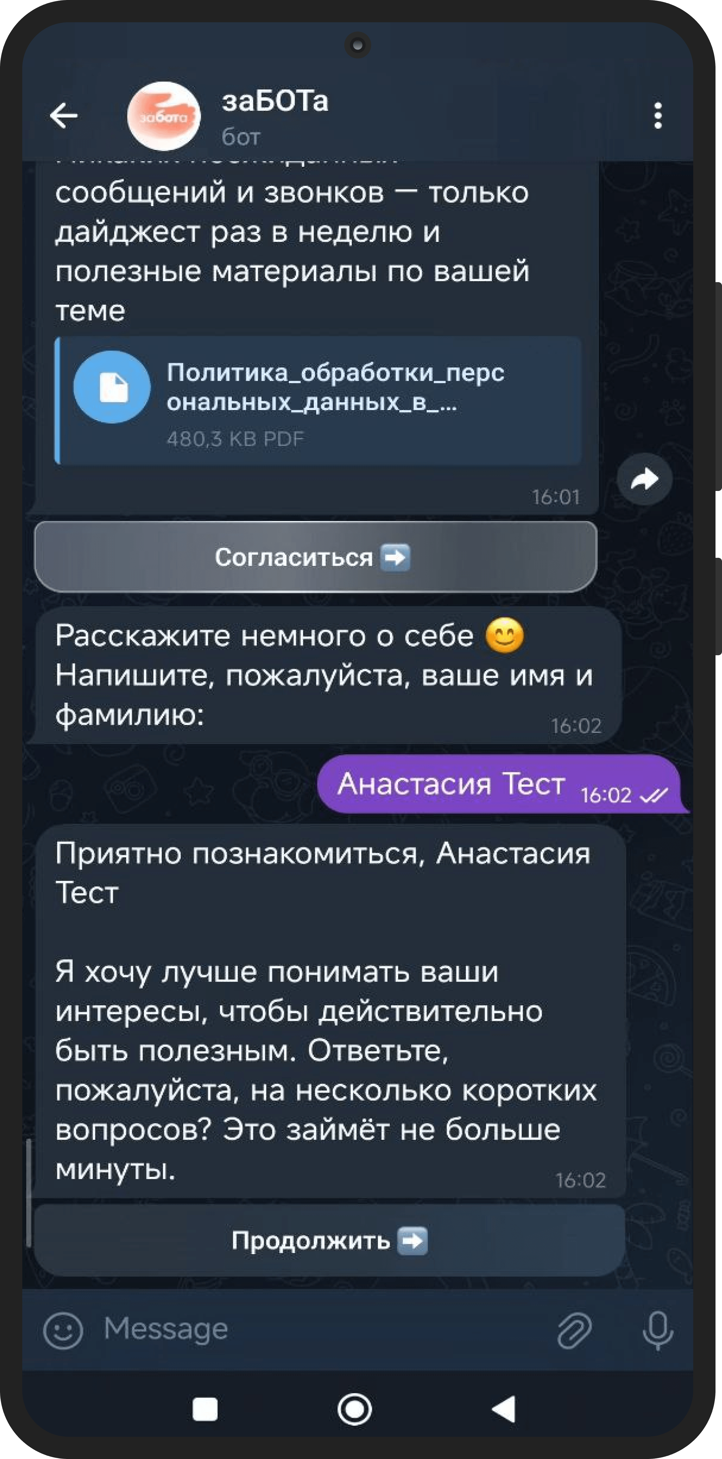 С первых секунд «заБОТа» объясняет, кто он такой: персональный помощник МИП. Пользователь соглашается с политикой обработки данных, указывает имя и фамилию и получает приглашение пройти короткую анкету.
