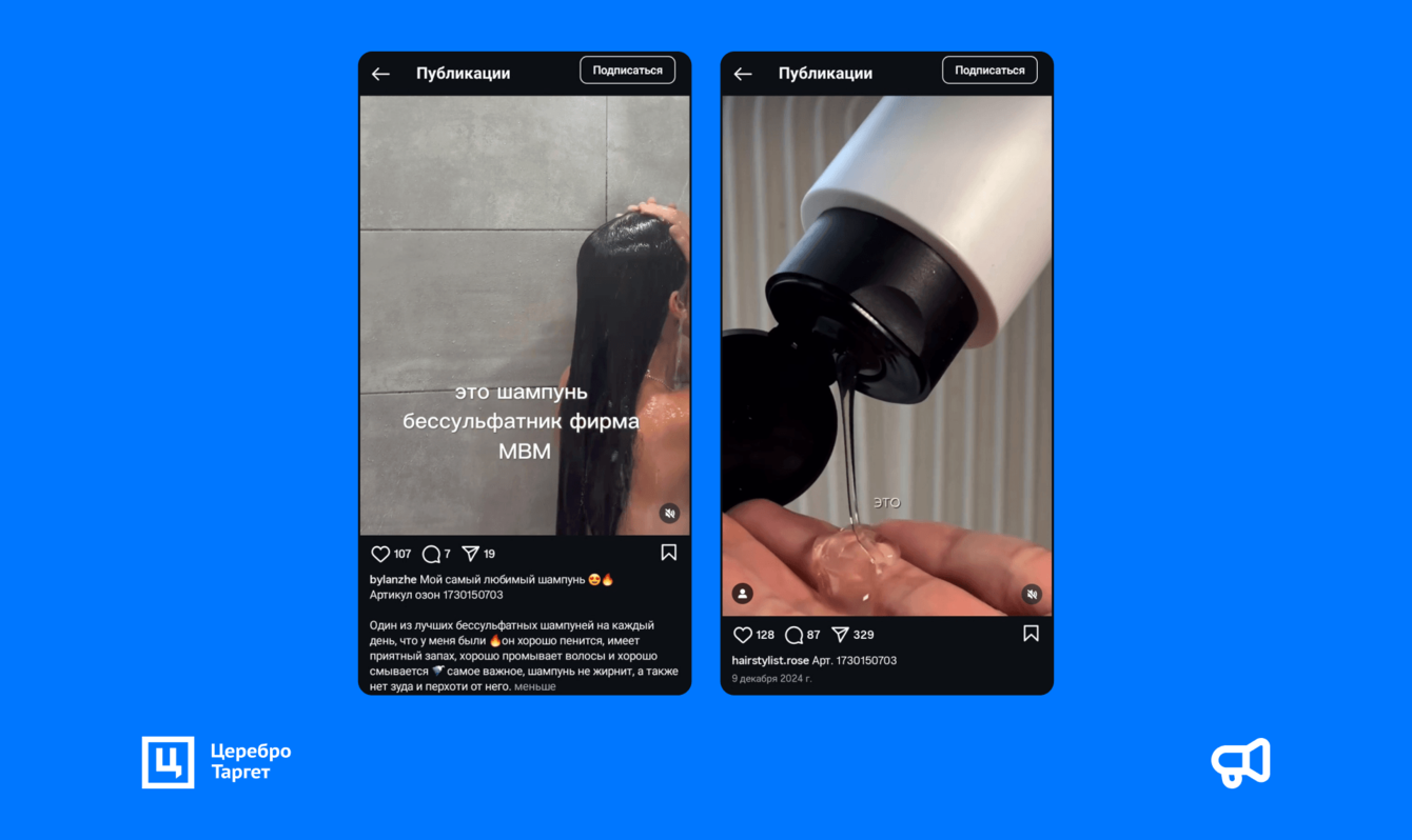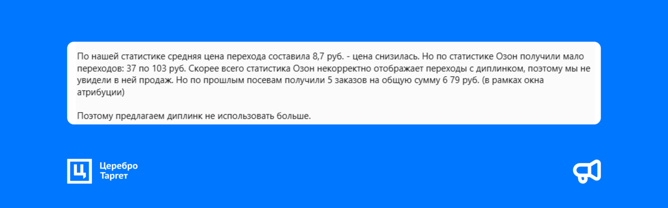 • Бонусные размещения на Ozon. Мы делали размещения в специальных сообществах, чтобы клиент получил бонусы на маркетплейсе. На эти бонусы он бесплатно откручивал внутреннюю рекламу Ozon, и результаты были гораздо слабее, чем на посевах. Клиент пришел к выводу, что запускать ее за деньги не имеет смысла. Этот опыт помог сэкономить бюджет на будущее.