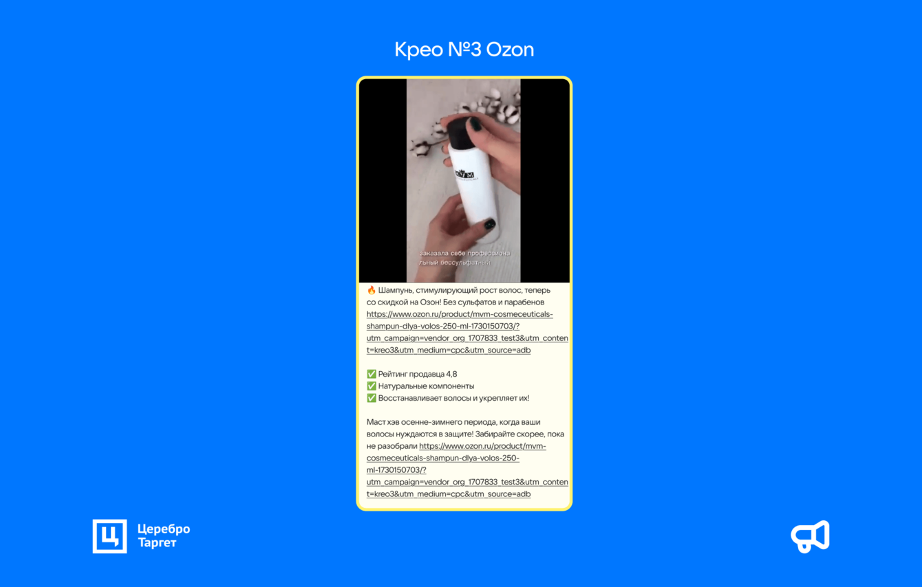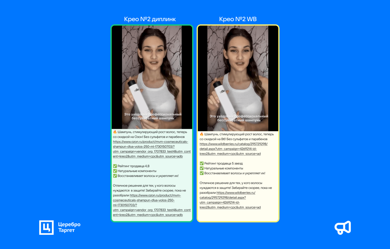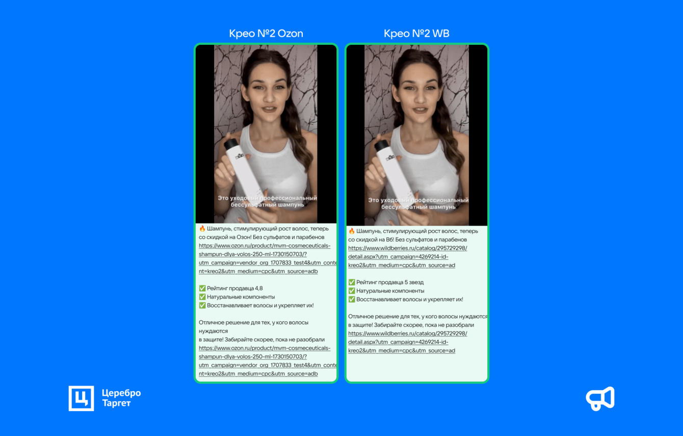 • Текст 1. Добавили заход через личное обращение: «Девочки, не могу молчать! Нашла крутой шампунь…»