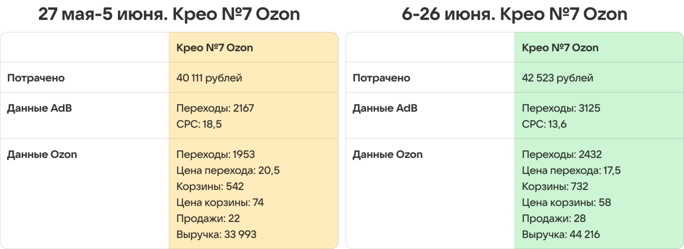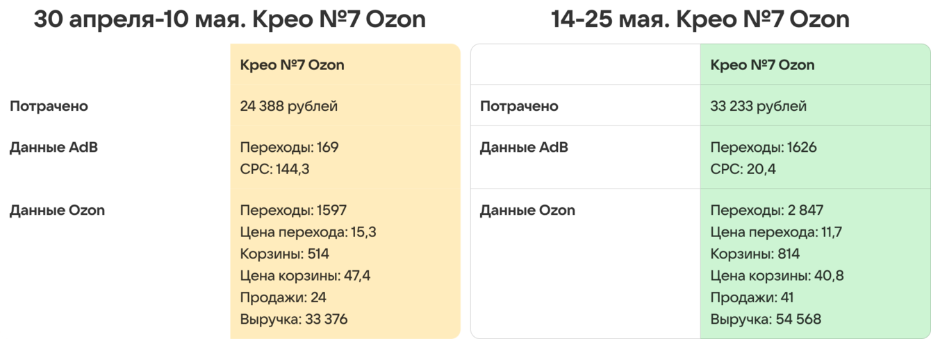 Крео №7 Ozon принес 70% всех продаж и выручки.
