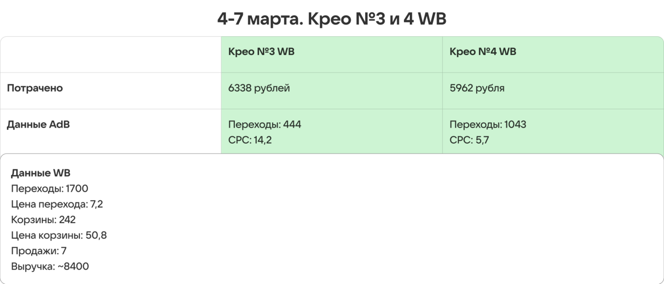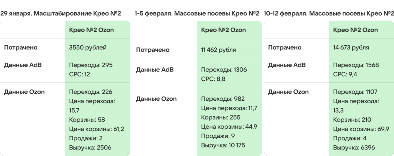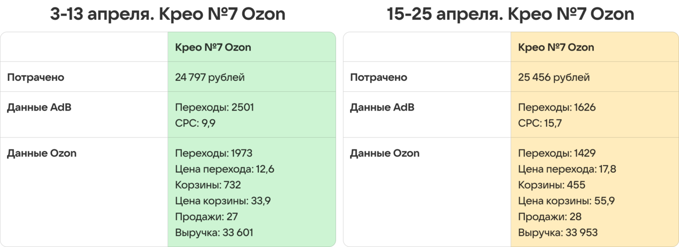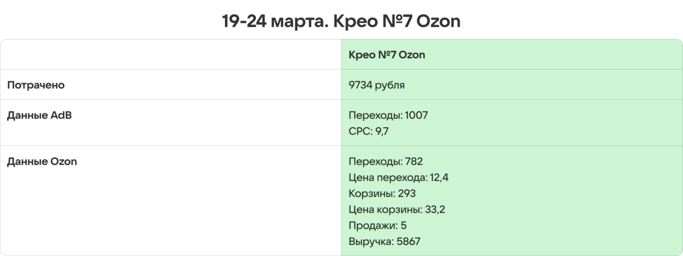 • Два креатива-лидера: все тот же Крео №7 и Крео №2 Ozon, который перестали откручивать в конце февраля. В эти посты изменений не вносили.
