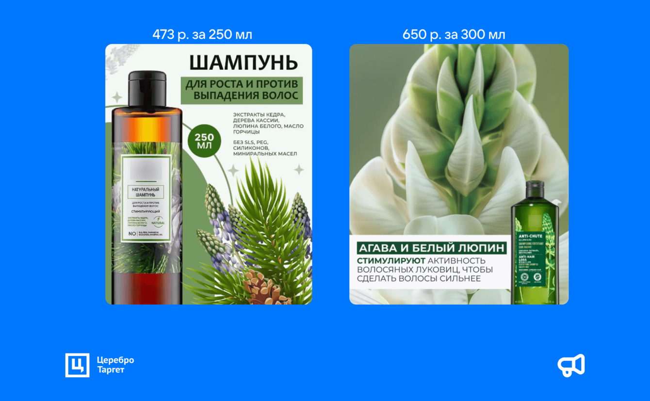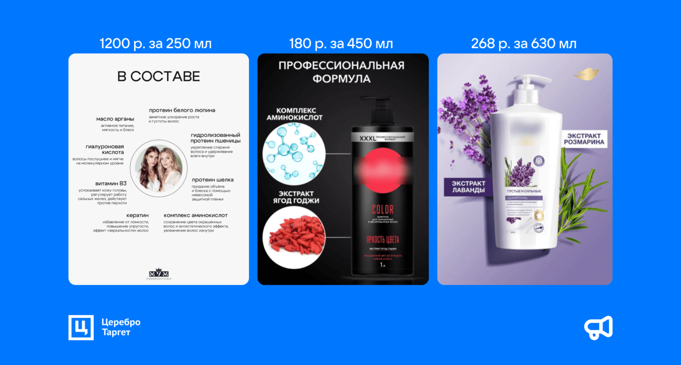 Резюмируем: цена шампуня нашего клиента — стандартная для ниши, но при этом активных веществ больше, чем у некоторых аналогов.