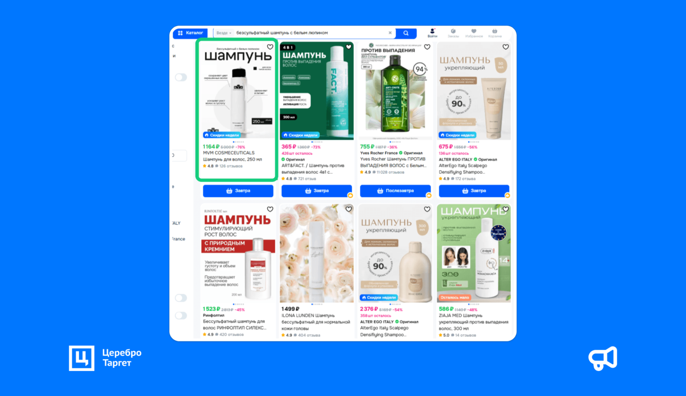 По запросу «бессульфатный шампунь с белым люпином» Ozon выдал карточки товаров стоимостью 700-2300 рублей. Продукт клиента на тот момент стоил 1100 рублей — значит, прайс стандартный в нише.