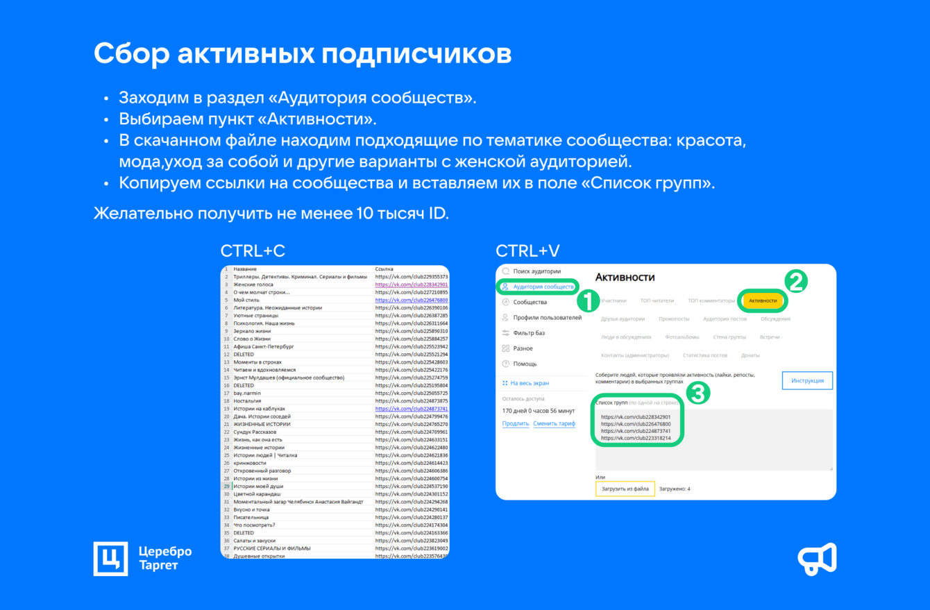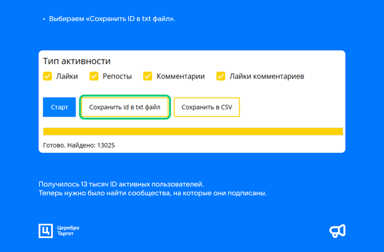 • Собрали ID активных подписчиков. То есть получили список тех, кто лайкал, комментировал, репостил в топовых сообществах.