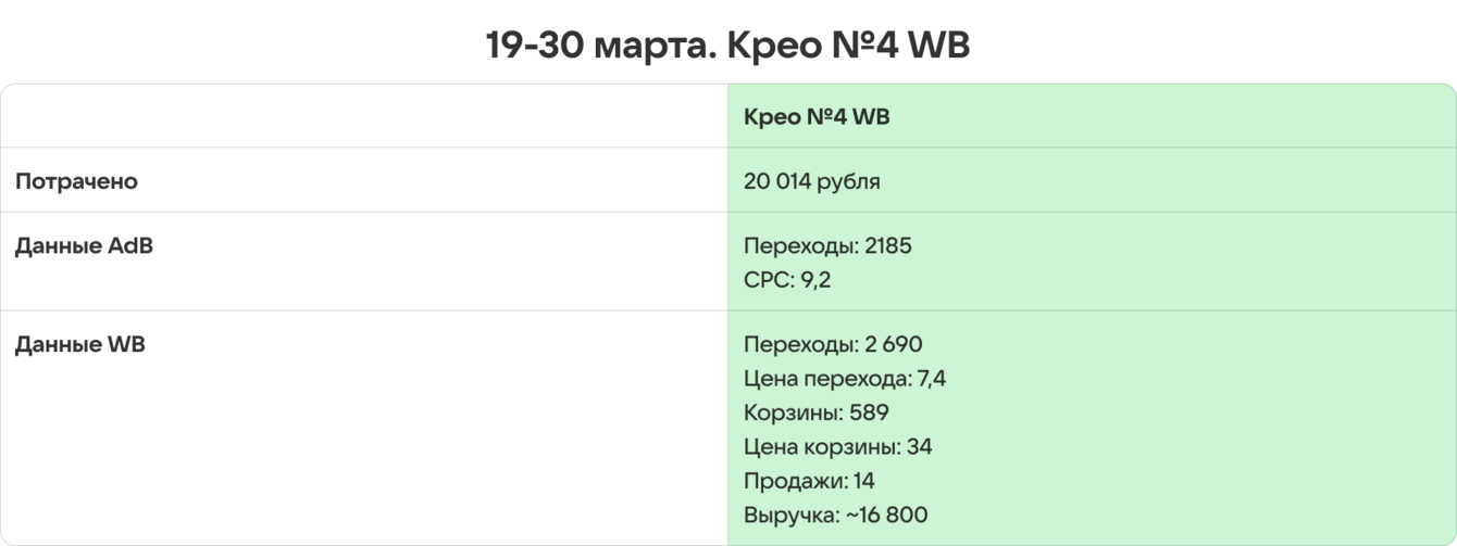 Нужно было протестировать WB → провели тесты, нашли рабочий креатив и получили минимальные CPC и цену корзины за всю РК: 5,8 и 24,8 рублей соответственно.