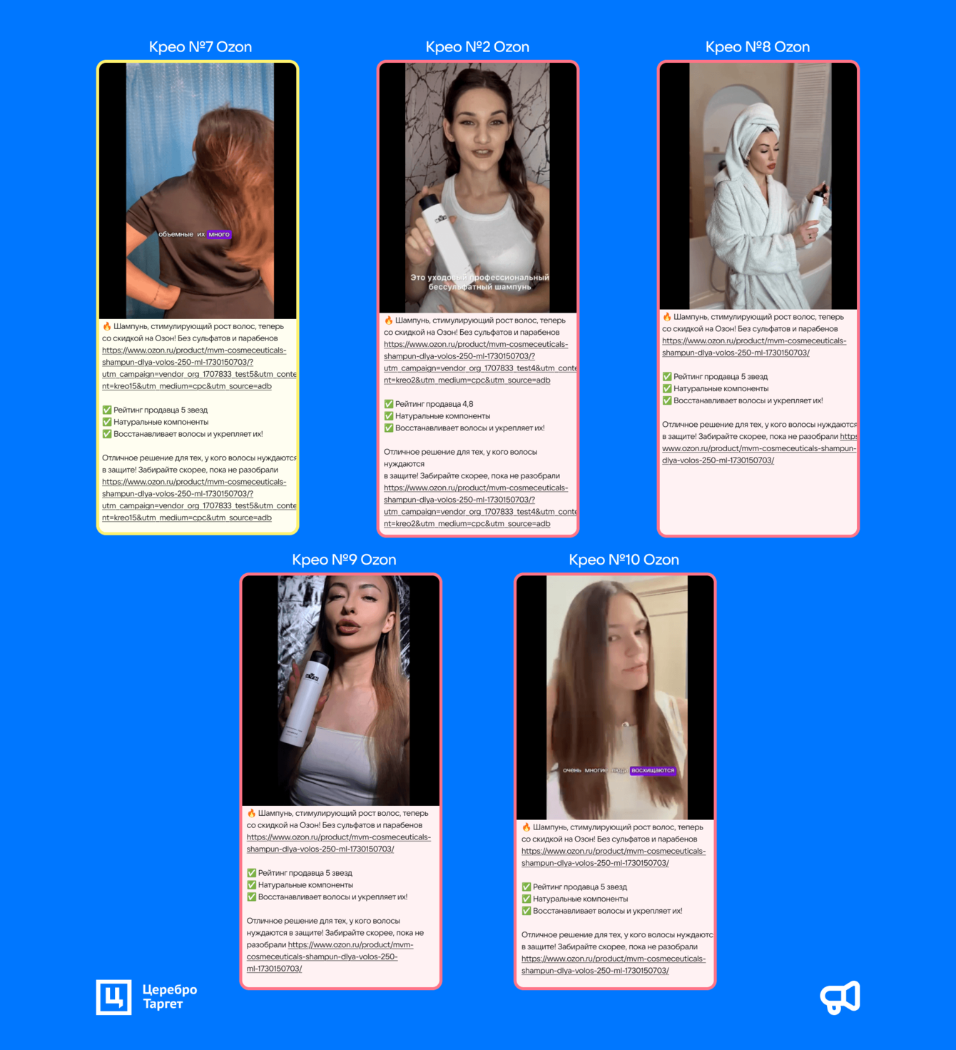 — Примеры креативов-лидеров для рекламы дорогого шампуня.