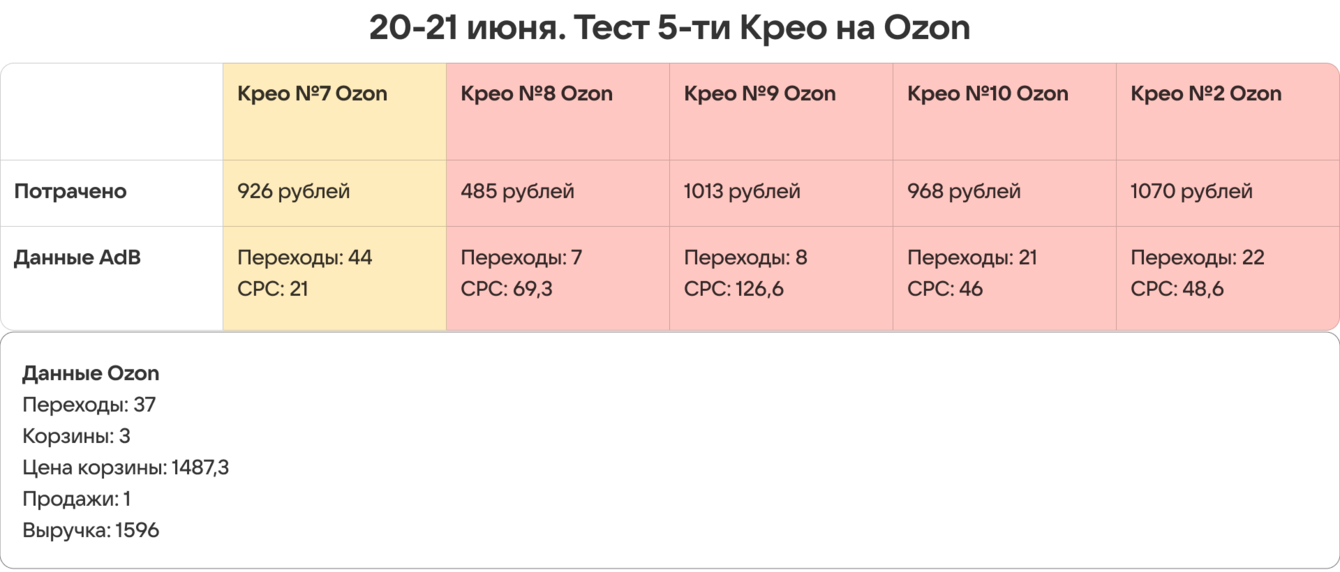 20-21 июня. Опять Крео №7 Ozon, возвращение Крео №2 Ozon и тест 3 новых креативов