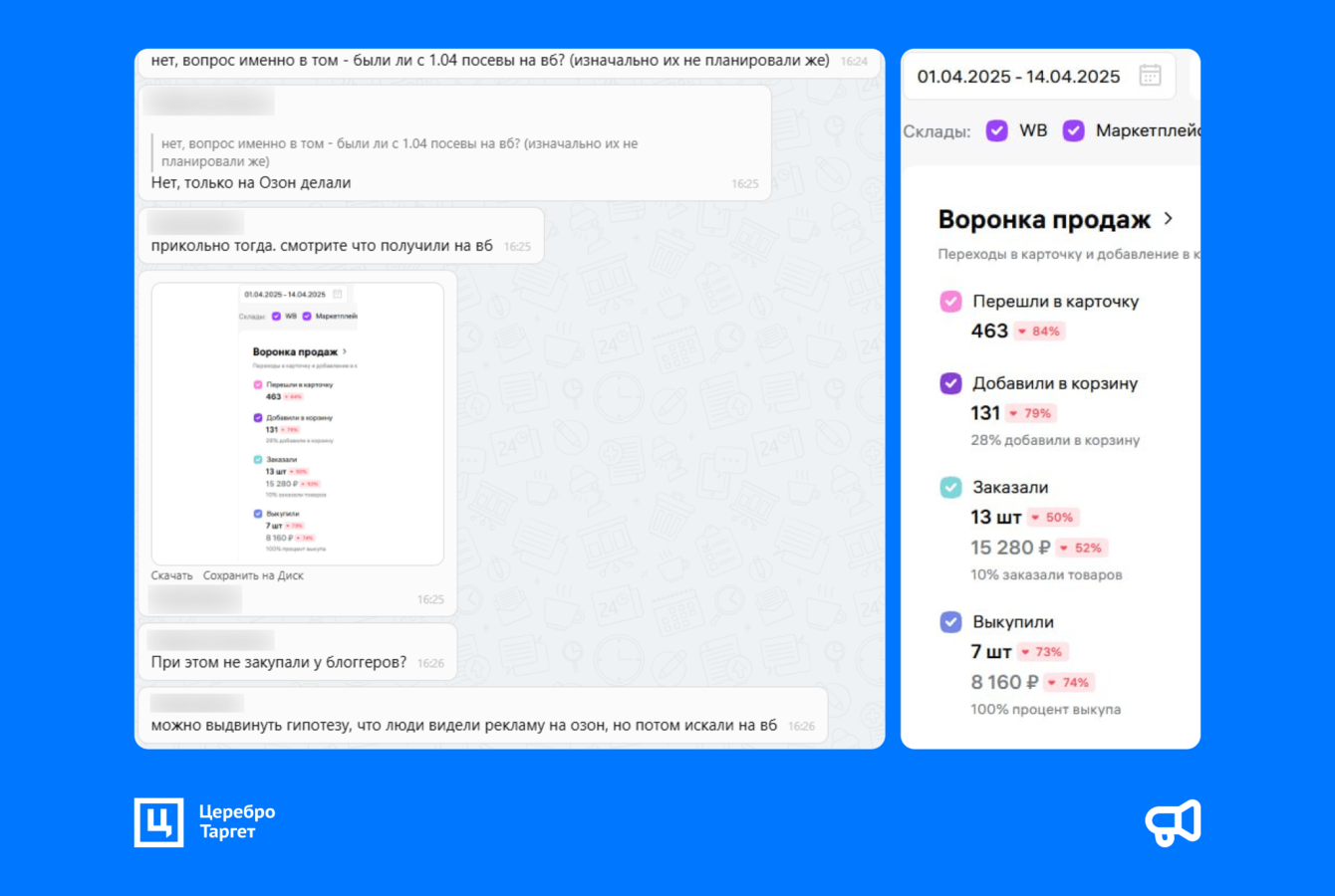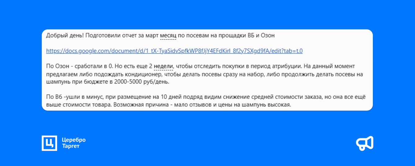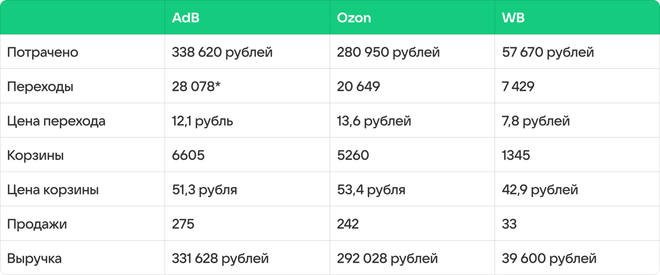 Изначально мы планировали только протестировать посевы, т.к. бренд только вышел на маркетплейсы. Основной задачей было продвижение на Ozon, а в дополнение к этому мы проверяли разные гипотезы. Тесты не всегда оказывались удачными: например, запуски на WB и ГЕО-посевы. Эти расходы негативно повлияли на итоговый баланс. Спросите, почему именно они? Потому что на Ozon у нас окупились расходы.