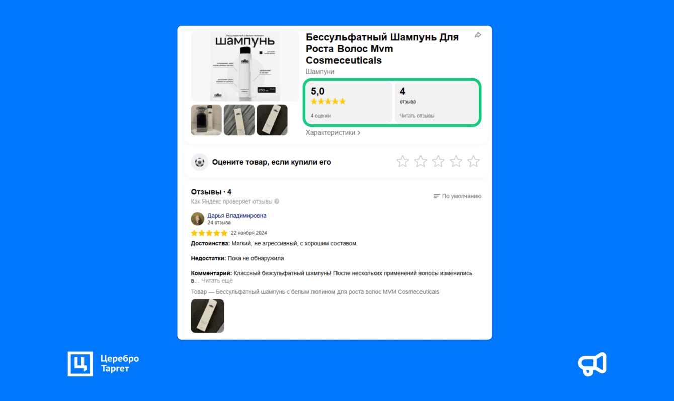 О чем это говорит? Небольшое количество оценок и объемные отзывы косвенно подтверждали отсутствие накрутки. То есть реальные покупатели высоко оценили шампунь.