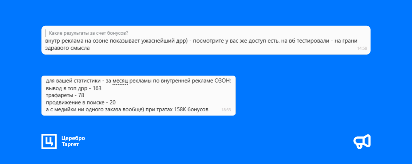 • Клиент месяц запускал внутреннюю рекламу Ozon бесплатно — за бонусы. Получил «ужаснейший ДРР» и пришел к выводу, что за деньги там продвигаться не стоит.