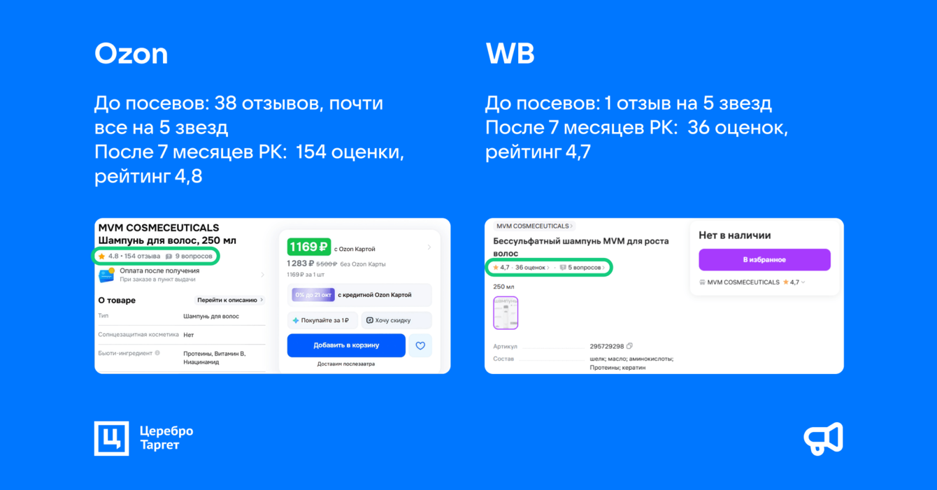 Клиент — начинающий селлер на Ozon и WB. Продает бессульфатный шампунь с белым люпином под брендом MVM COSMECEUTICALS. Цена товара — 1000-1500 рублей за 250 мл. Продукт относится к лечебно-косметическим средствам и действует мягче, чем обычный шампунь.