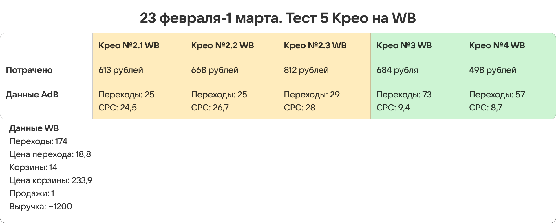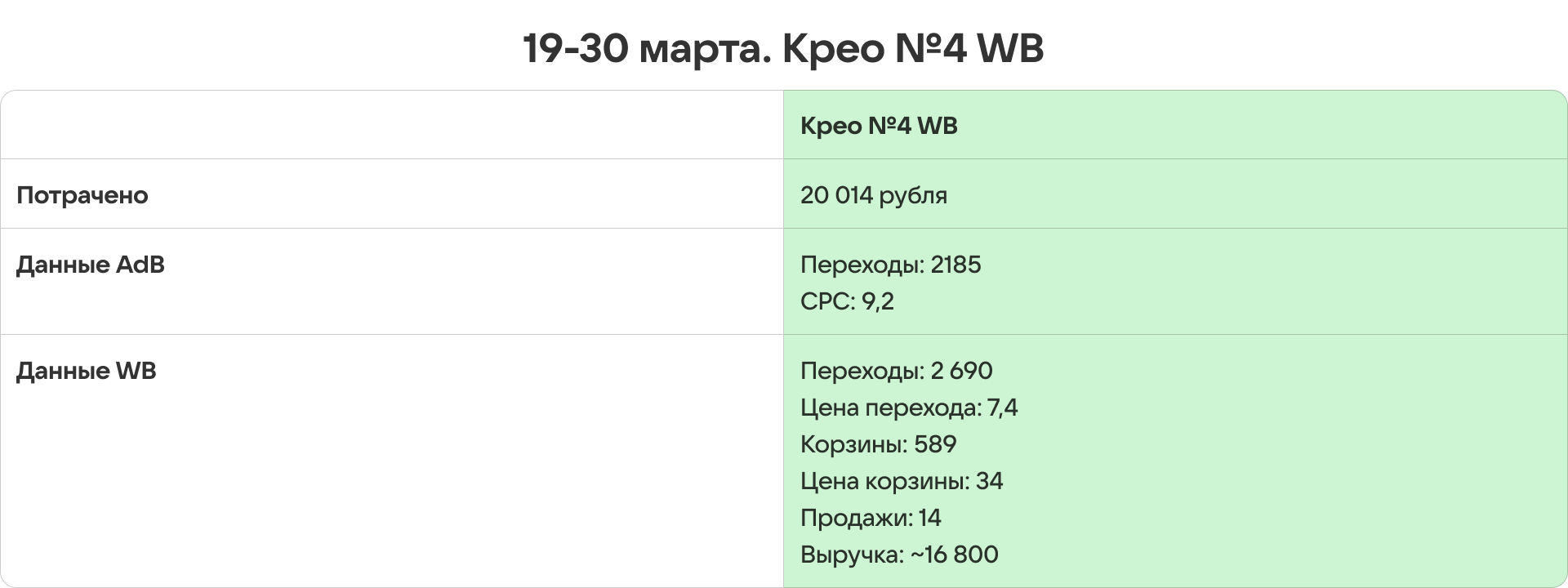 Нужно было протестировать WB → провели тесты, нашли рабочий креатив и получили минимальные CPC и цену корзины за всю РК: 5,8 и 24,8 рублей соответственно.