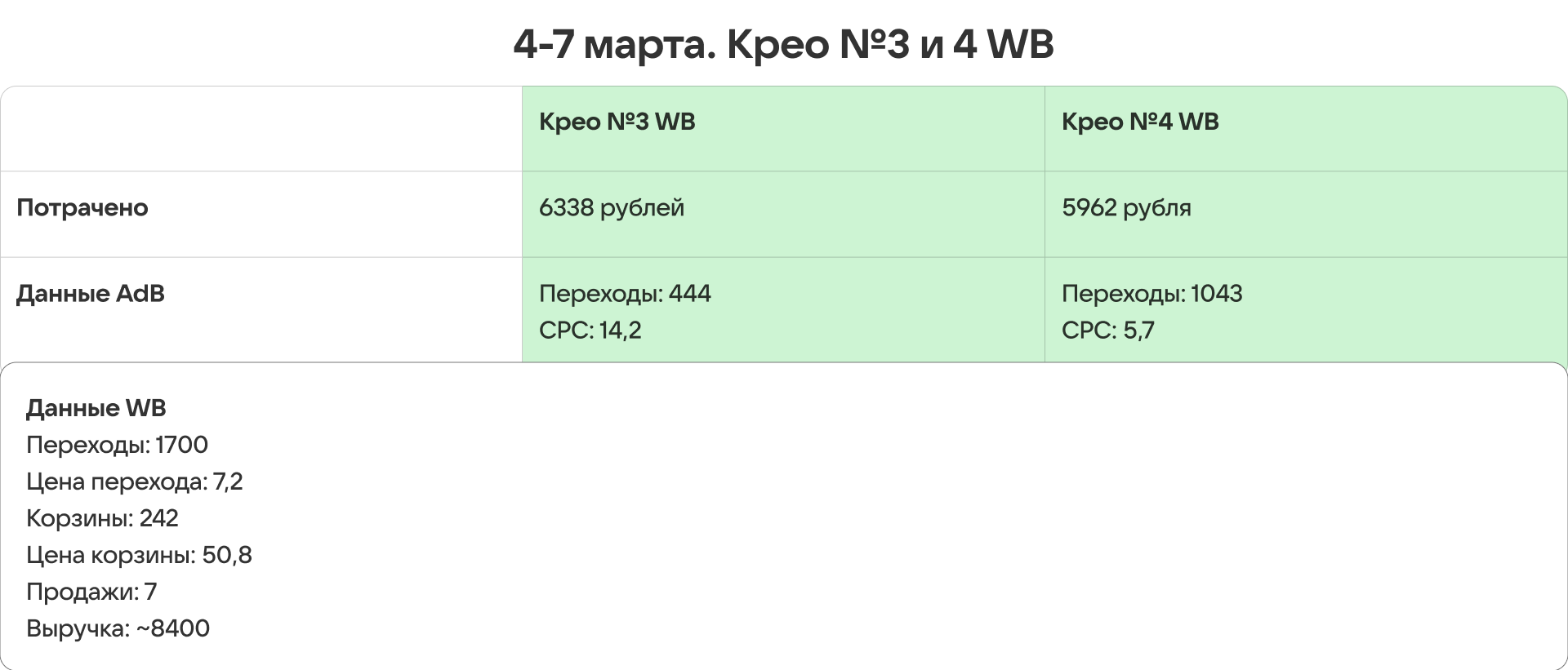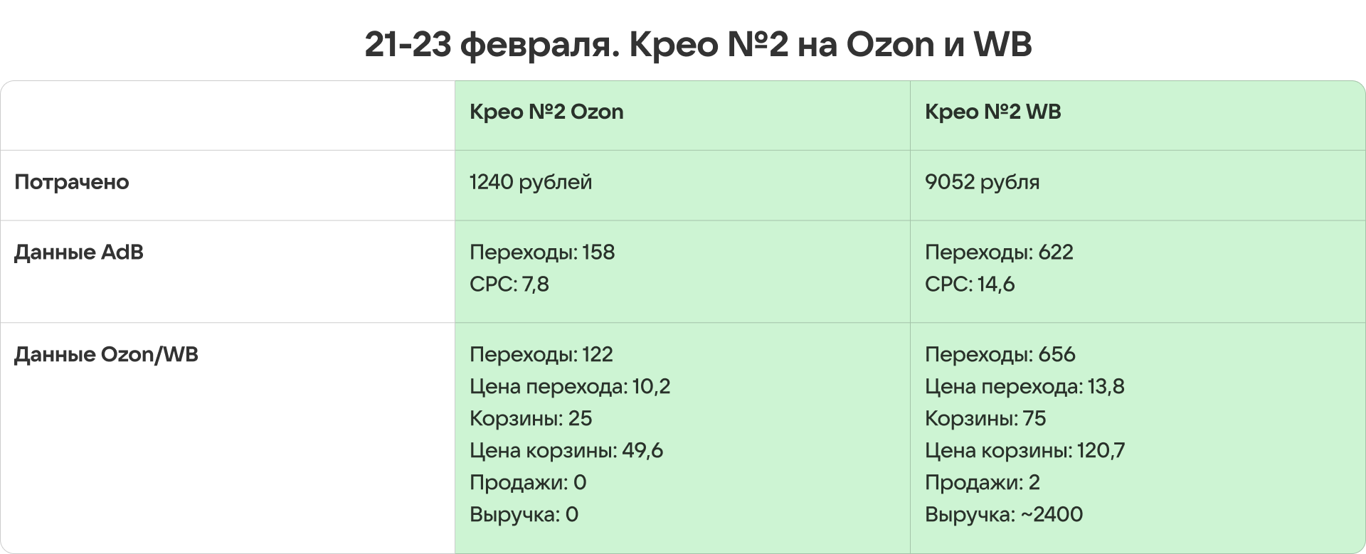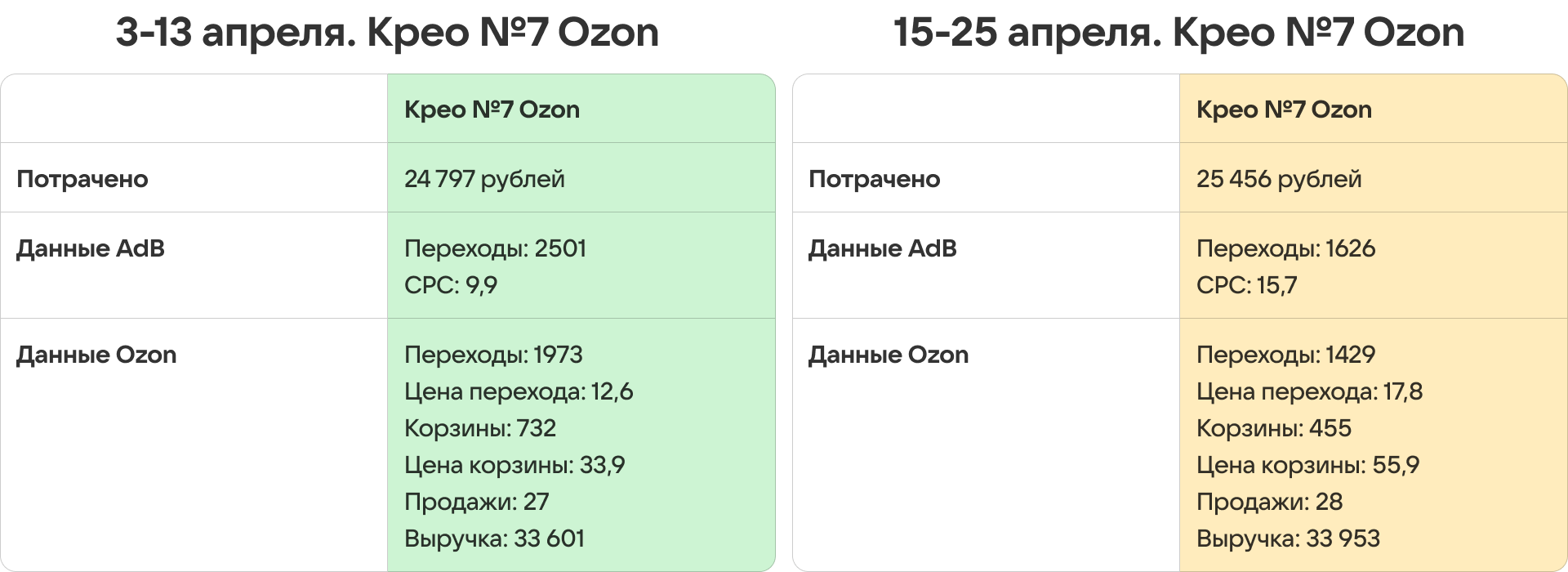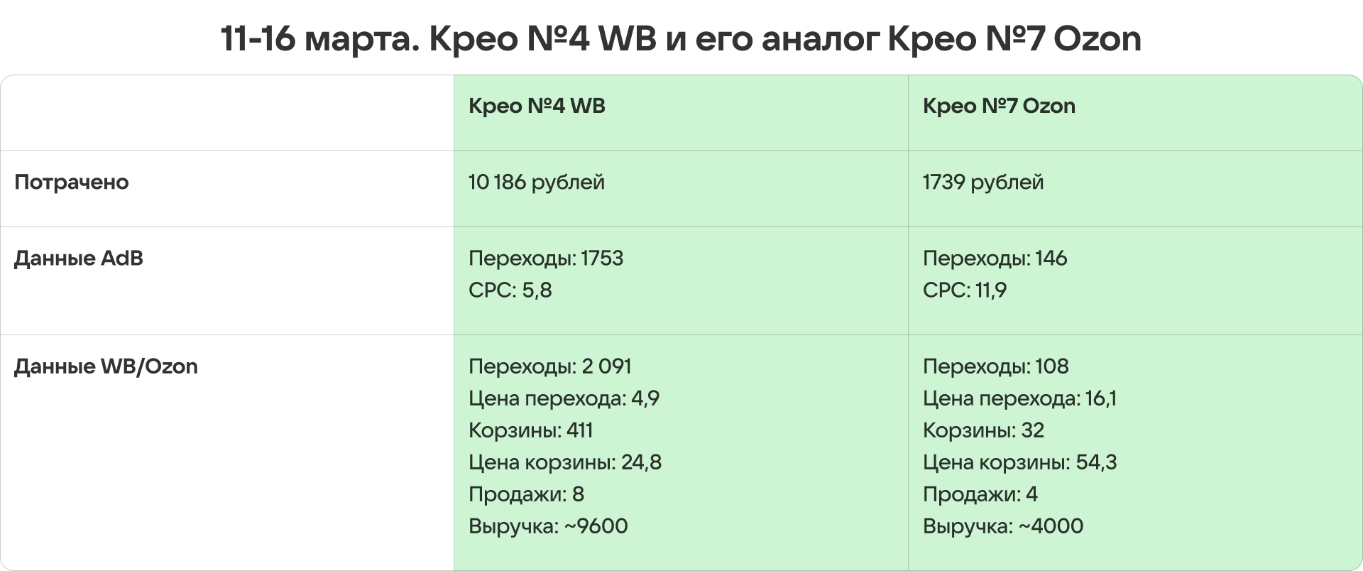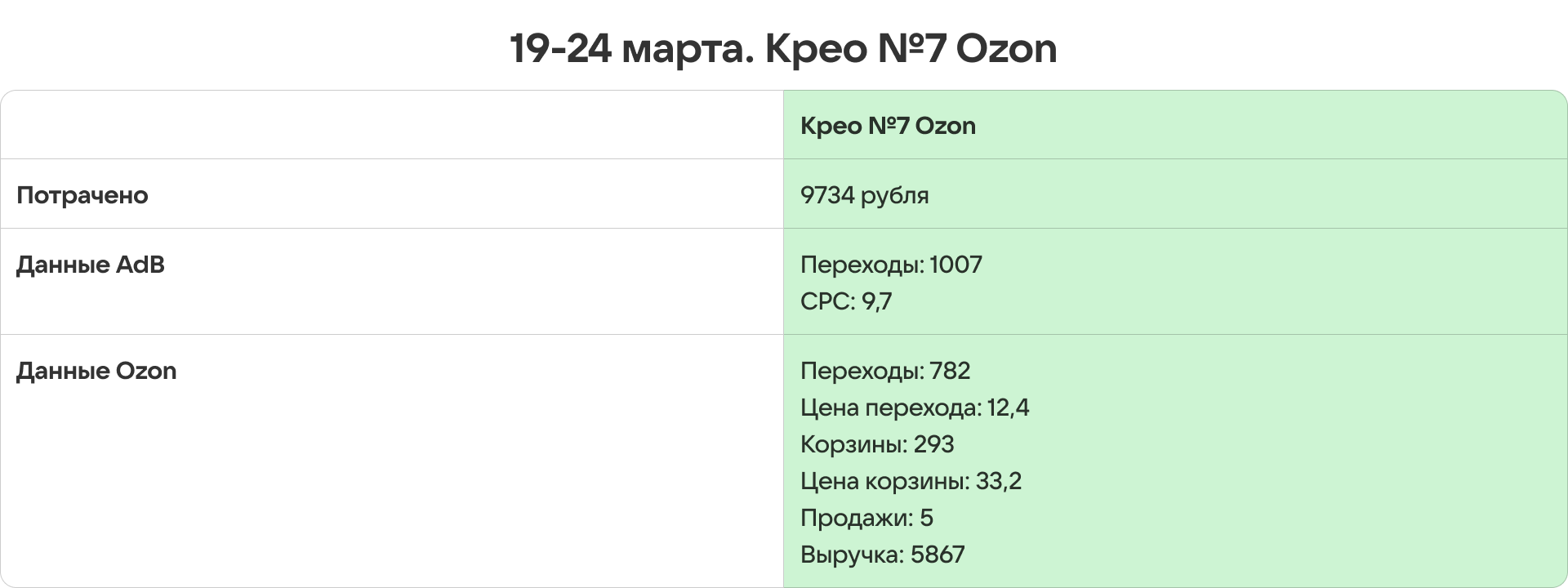• Два креатива-лидера: все тот же Крео №7 и Крео №2 Ozon, который перестали откручивать в конце февраля. В эти посты изменений не вносили.
