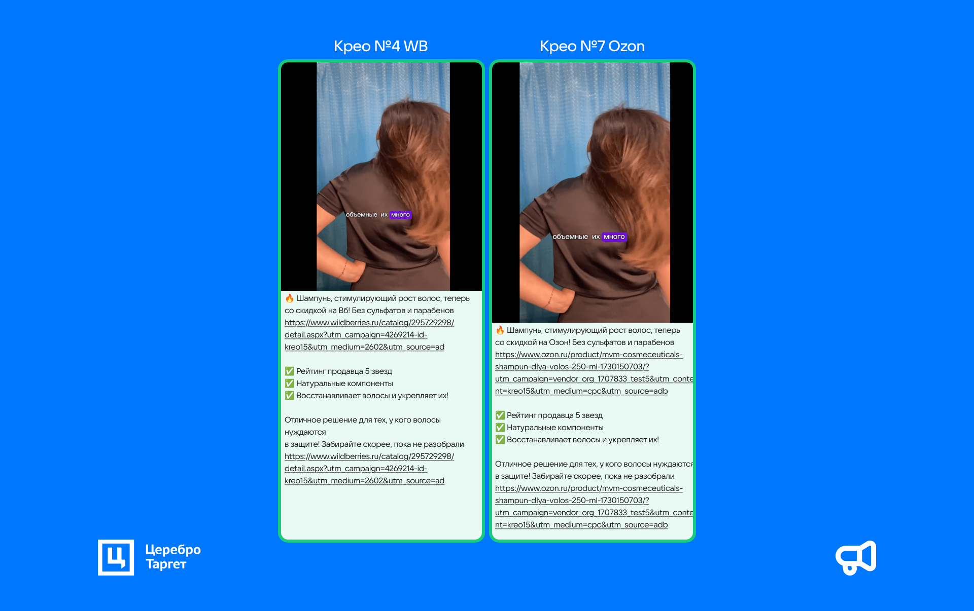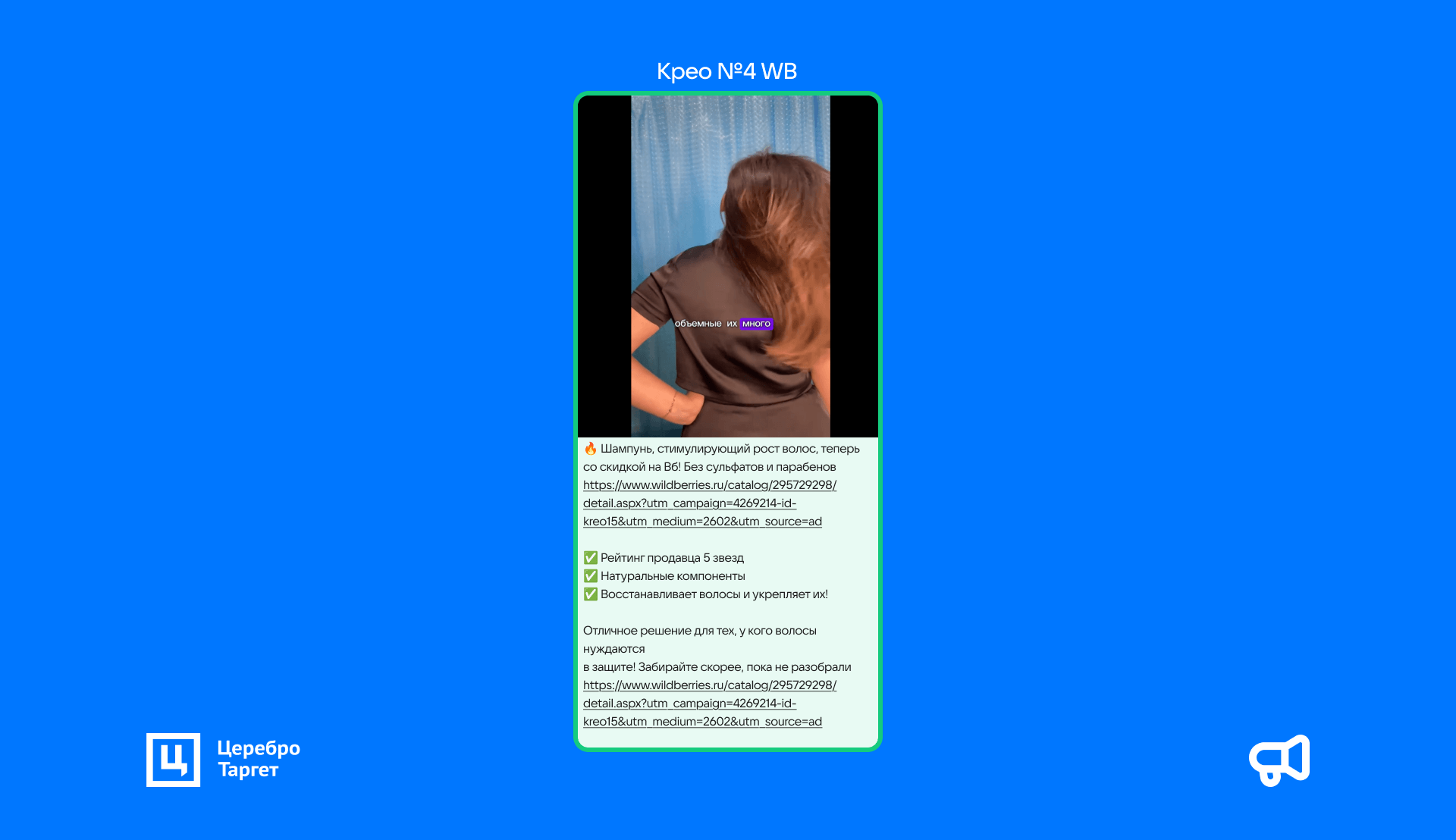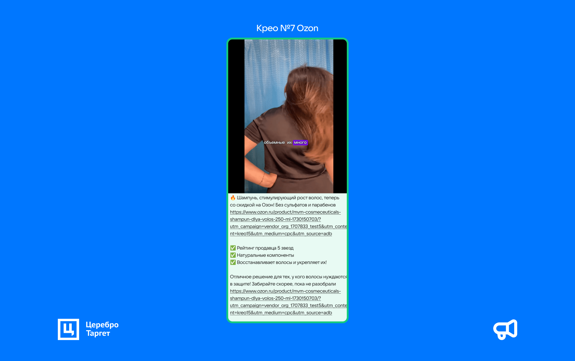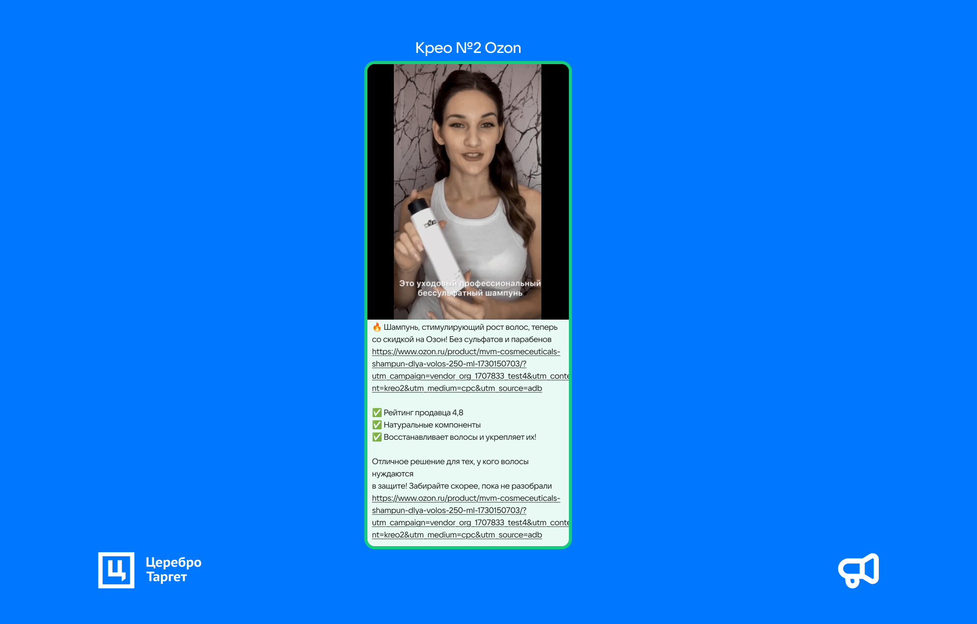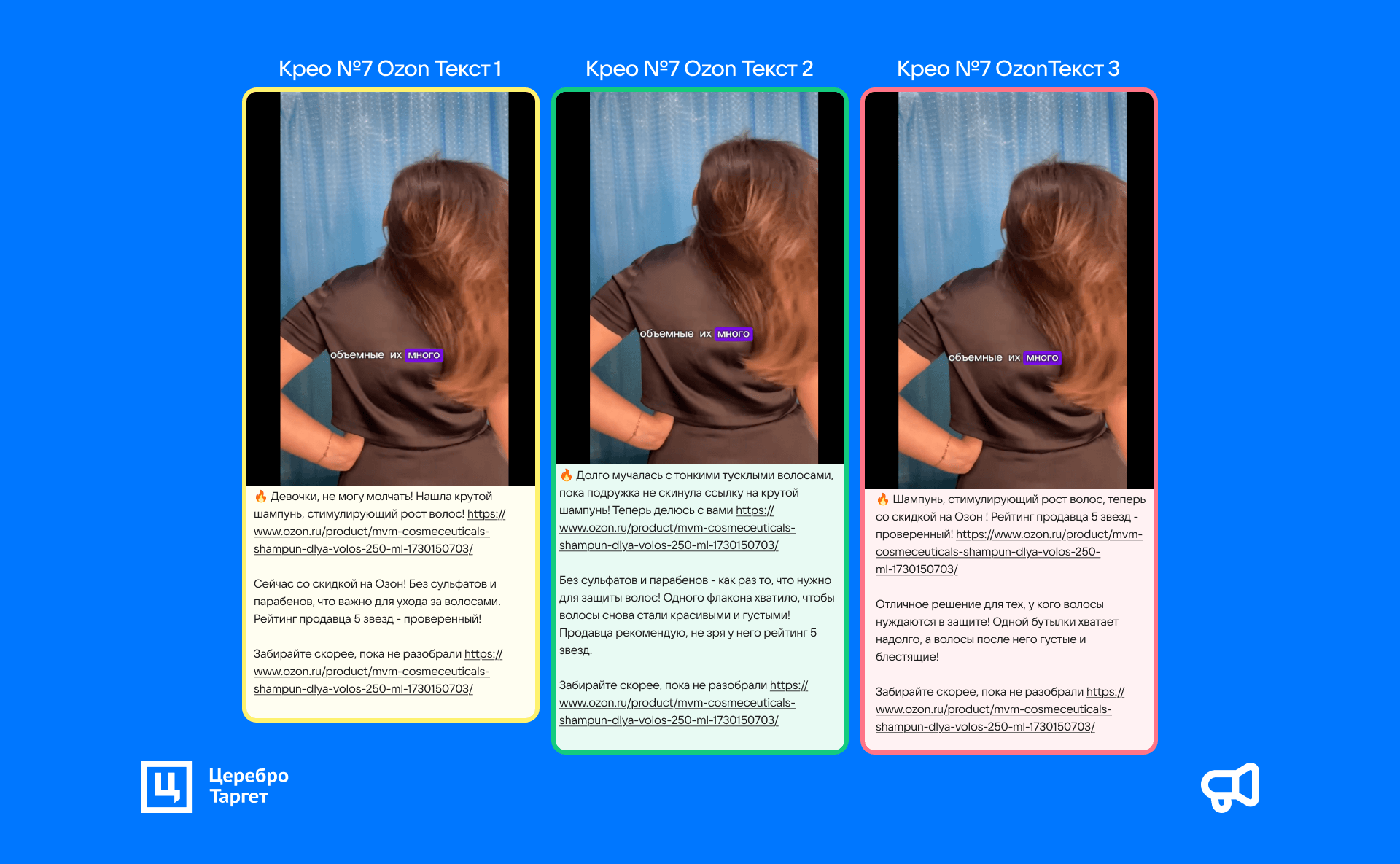 • Текст 1. Добавили заход через личное обращение: «Девочки, не могу молчать! Нашла крутой шампунь…»