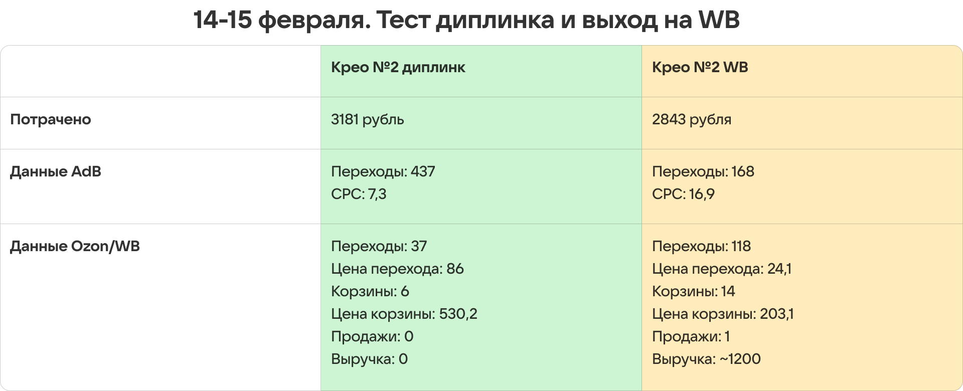 • Много нерелевантного трафика. Здесь у нас есть аргумент против. Мы размещали аналогичные креативы в одной и той же подборке сообществ для обоих маркетплейсов. При этом на Ozon конверсия выше — значит, дело не в трафике.
