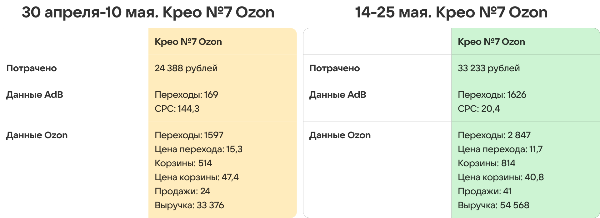 Крео №7 Ozon принес 70% всех продаж и выручки.