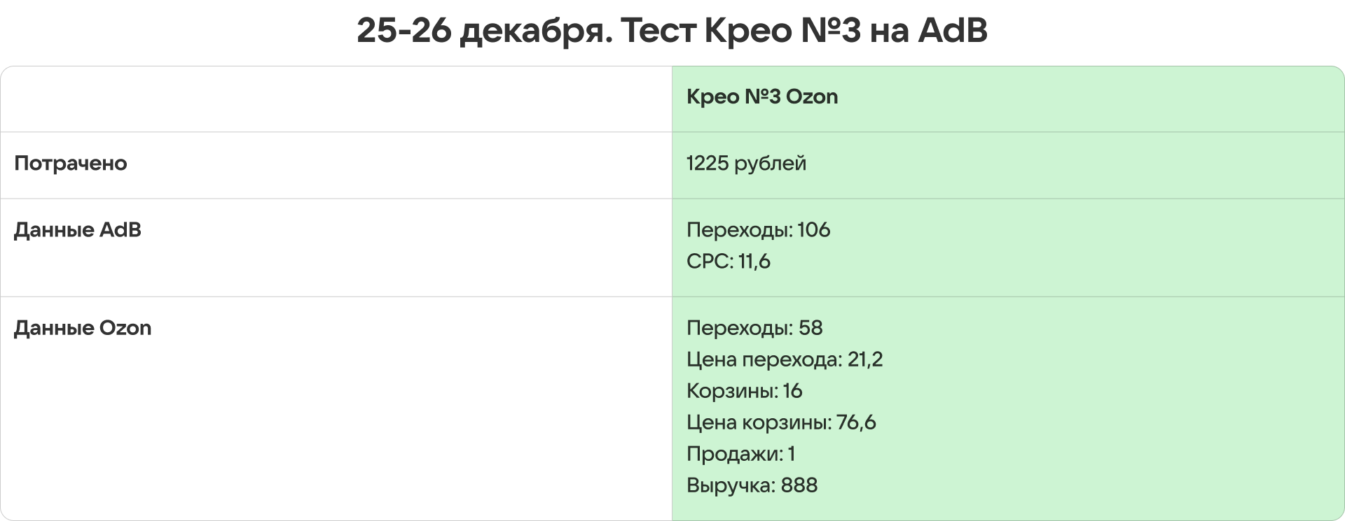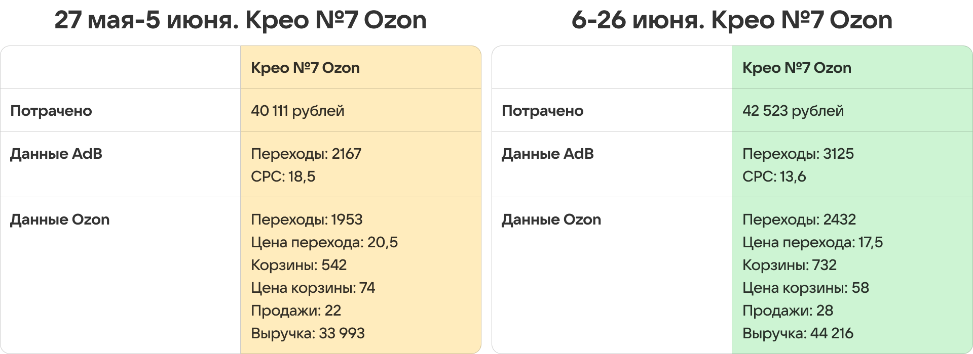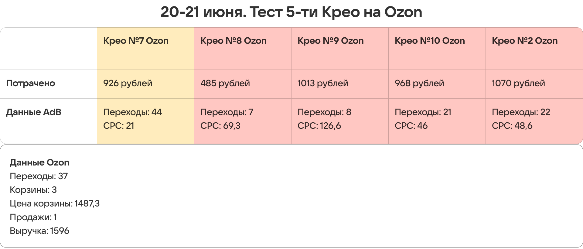 20-21 июня. Опять Крео №7 Ozon, возвращение Крео №2 Ozon и тест 3 новых креативов