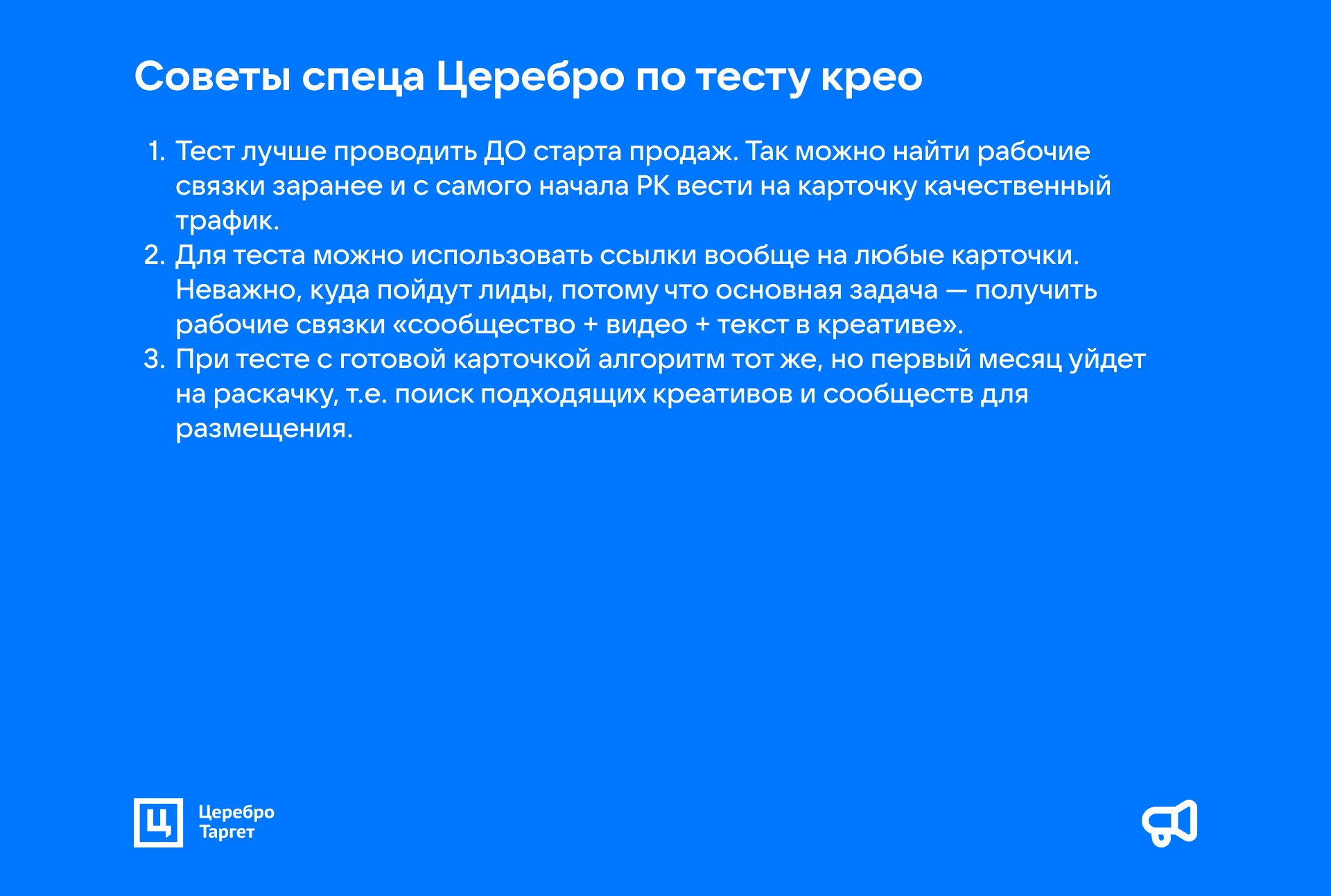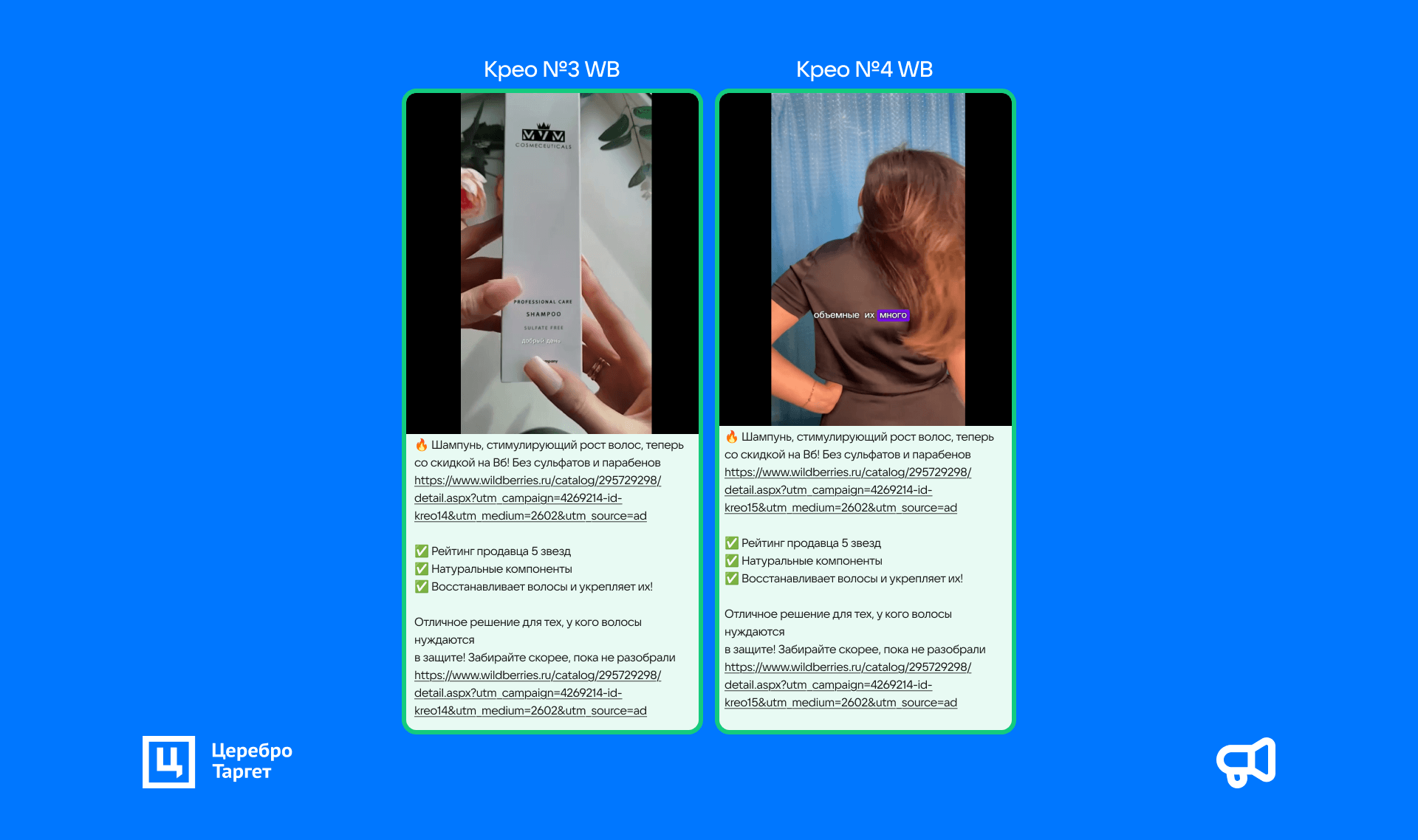 • Три новых креатива. Для них взяли текст из креативов-лидеров и новые видео.