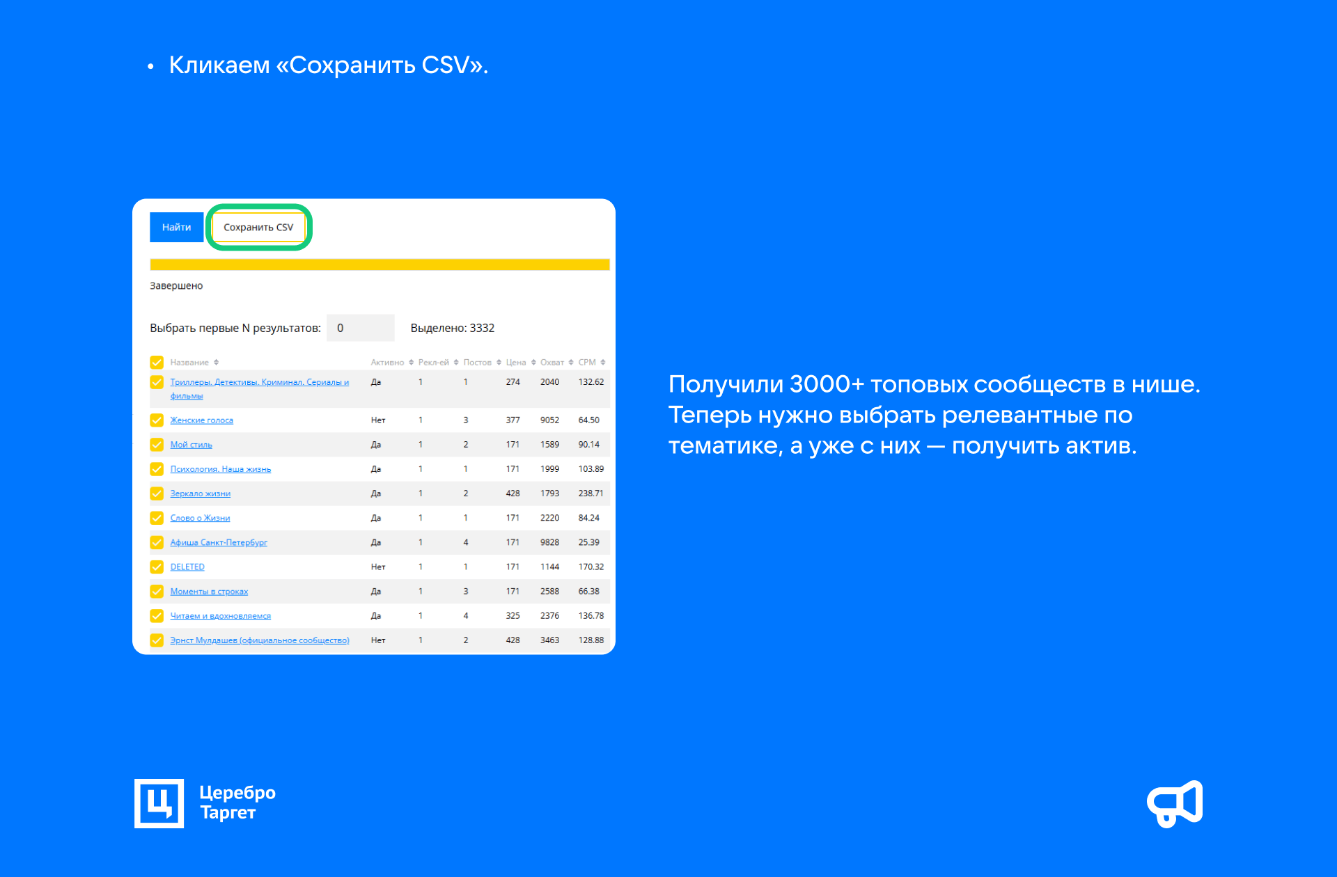 Итак, мы получили готовый список из 159 сообществ для размещения посевной рекламы.