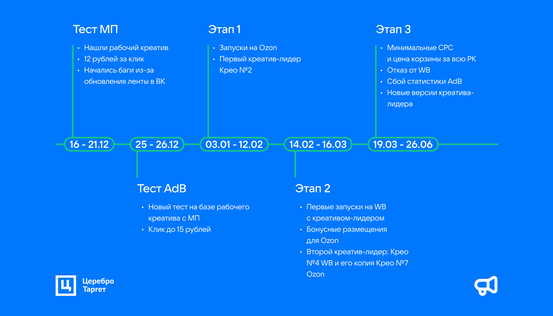 Переход на AdBlogger. На втором этапе теста начались баги на МП из-за обновления ленты в ВК. После этого перешли на AdB, чтобы продолжить работу над проектом. Это позволило нам улучшить показатели и достичь желаемого результата.