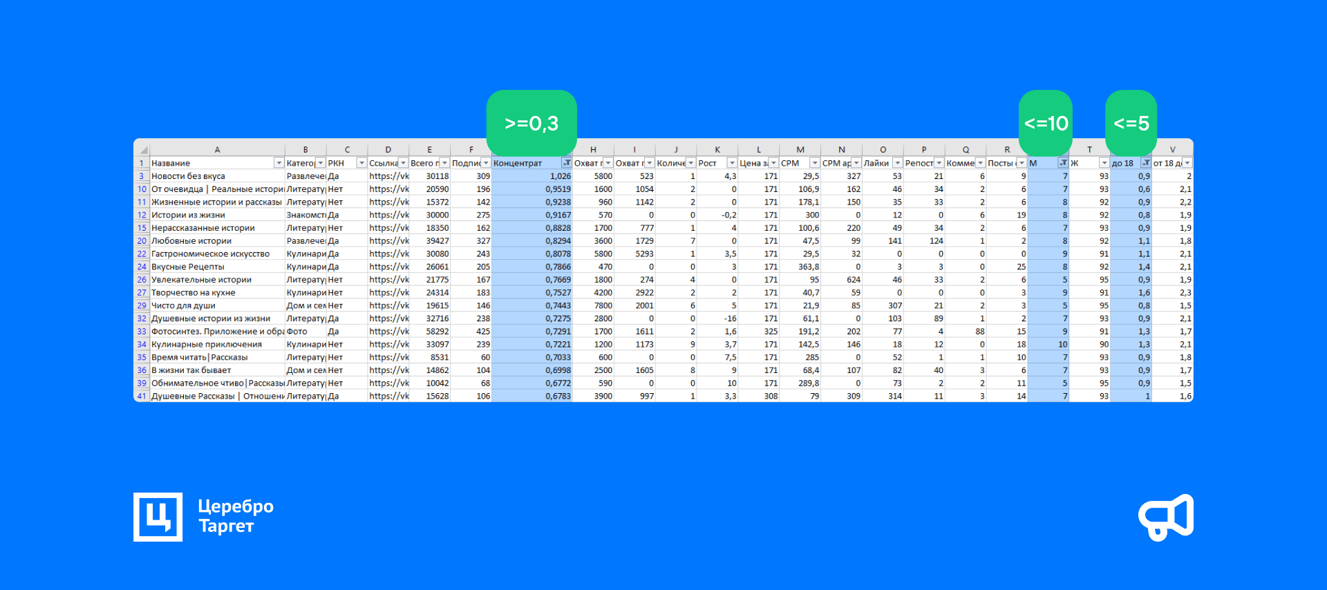 • Концентрат — это доля активной ЦА среди подписчиков сообщества. Чем выше этот показатель, тем лучше. Подбирать его нужно вручную. У нас получилось «больше или равно 0,3» и 159 сообществ.