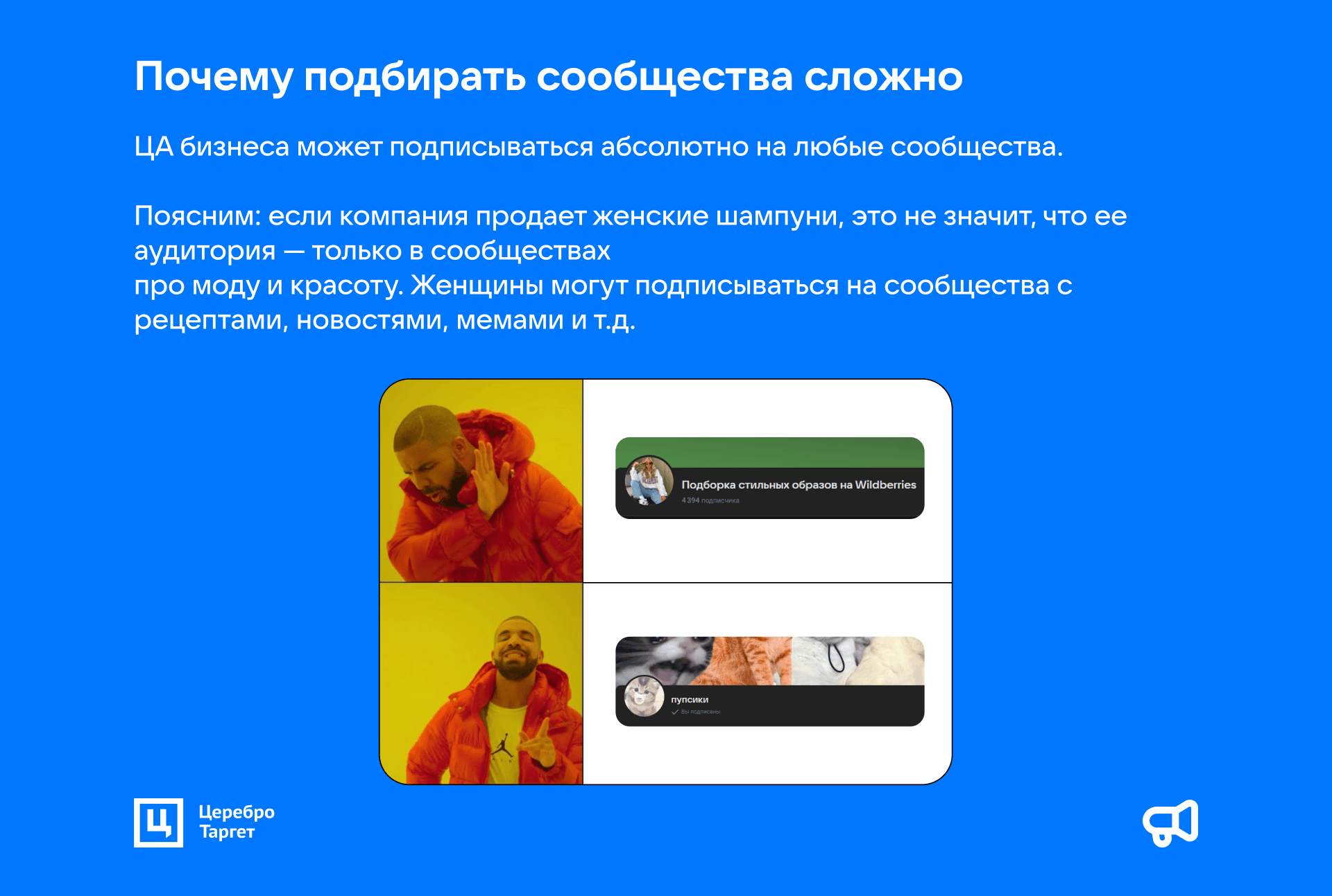 Следующим шагом сообщества предстоит отфильтровать по полу и другим метрикам, чтобы оставить наиболее подходящие по сочетанию параметров. Строгость фильтрации зависит от самого продукта. Мы собираемся продвигать женский шампунь — универсальный товар со стандартной для посевов ценой. Аудитория в этом случае широкая, так что фильтровать можно мягко: по 3 критериям из 6 возможных.