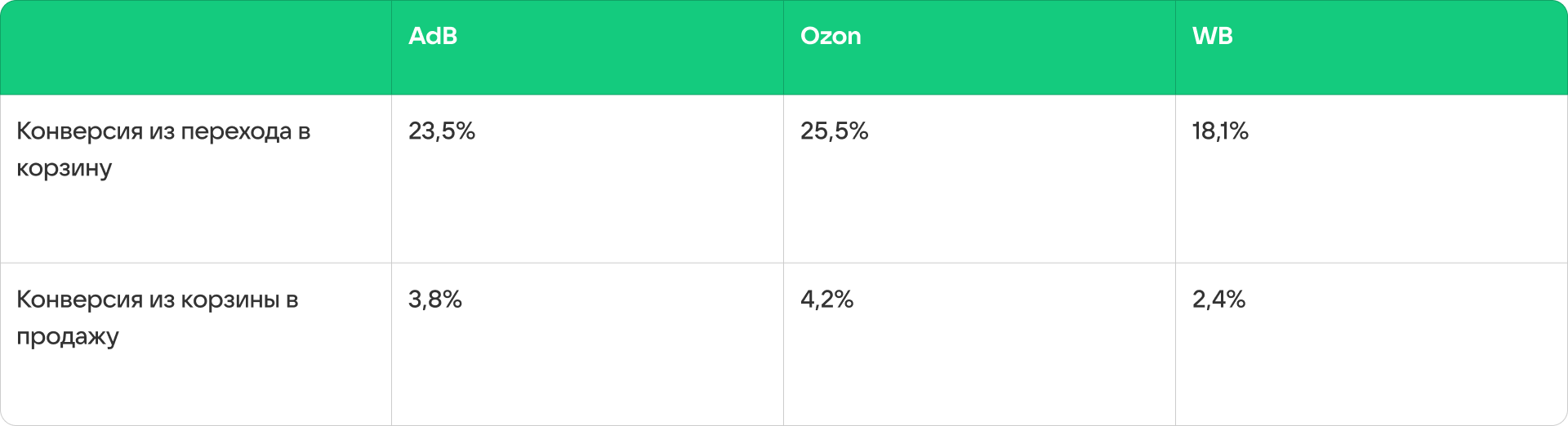 На WB — самые низкие показатели конверсии по обоим критериям. На это может быть две причины: