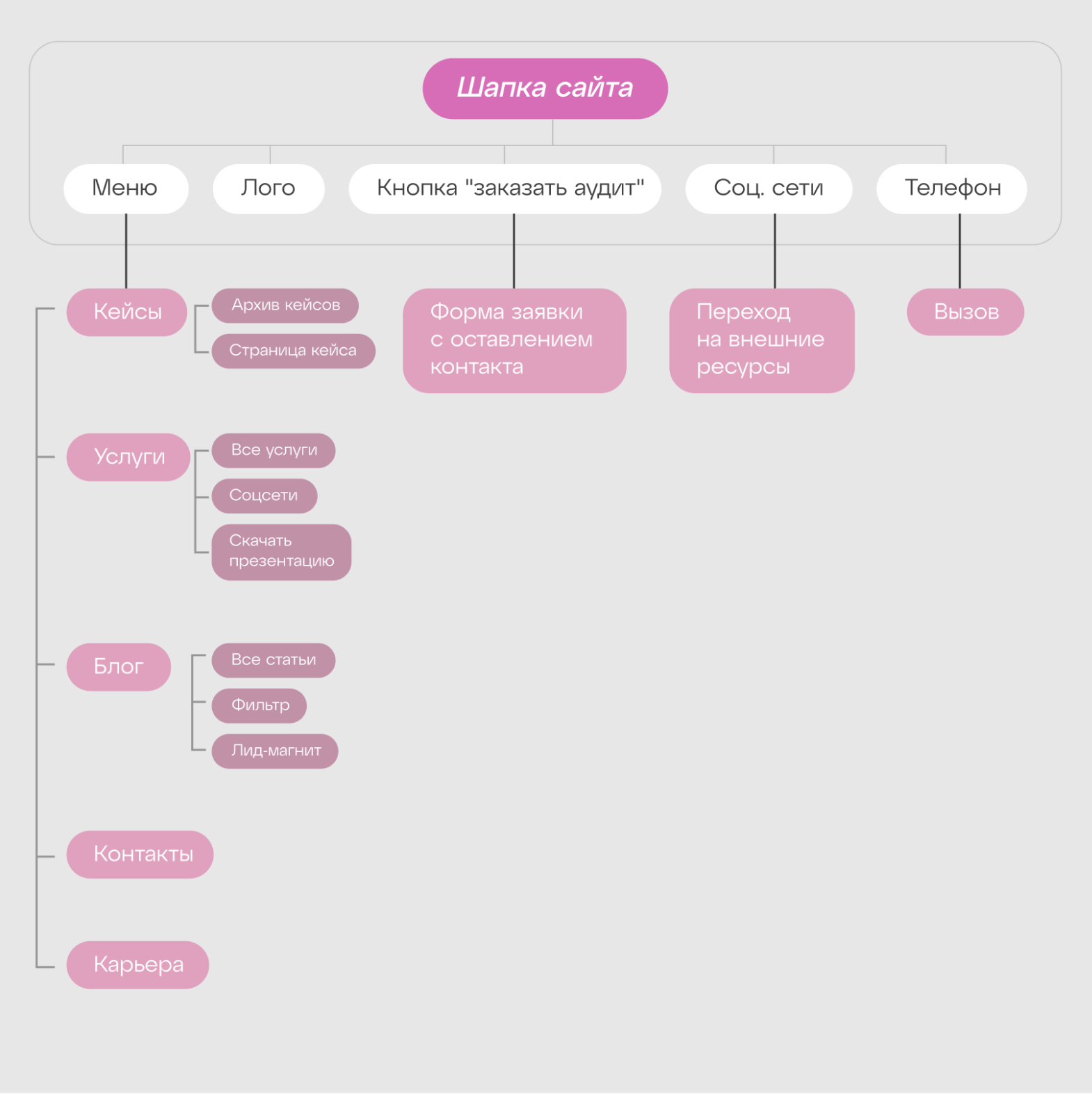 Дальше начинается самое интересное! Разработали структуру страниц — ориентир в создании ТЗ для дизайнера и копирайтера. Структуру мы тоже разрабатывали на основе конкурентного анализа. Так становится понятнее, какие элементы точно стоит внедрить, а какие лишь перегружают сайт и не несут никакой пользы.