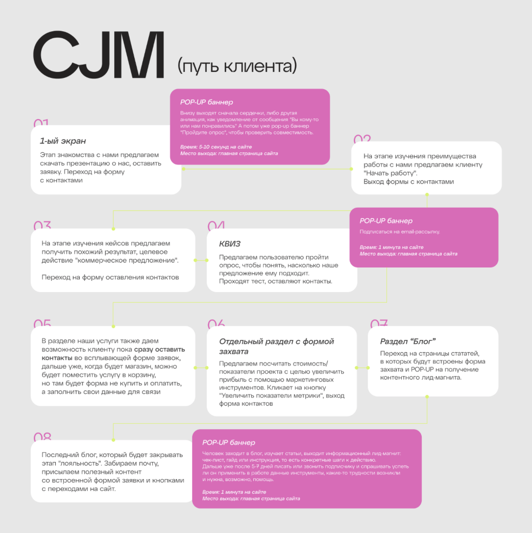 На основе исследования составили собственный путь клиента. Было важно понять, как пользователи принимают решение о покупке, какие у них мотивы, что для них важно при выборе агентства. А главное — как мы можем мотивировать обратиться именно к нам.