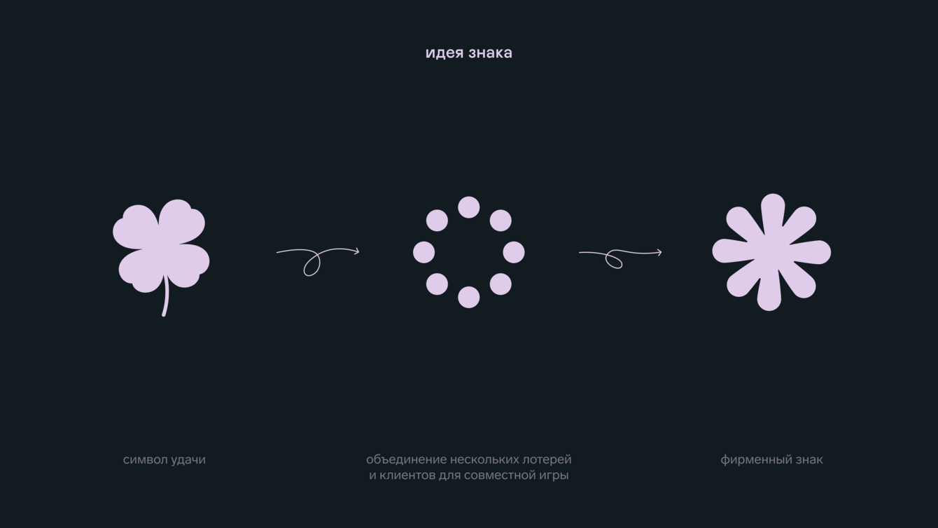 Самый счастливый момент в игре в лотерею — это победа. А когда ты играешь в компании друзей, то это ваша общая победа — она дружелюбная, яркая, по-детски азартная. Для того, чтобы передать настроение азарта, яркости момента игры и увлекательного процесса, был разработан шрифтовой логотип с литерами (буквами), которые передают эти ощущения. В них читается улыбка, игривость и современность.