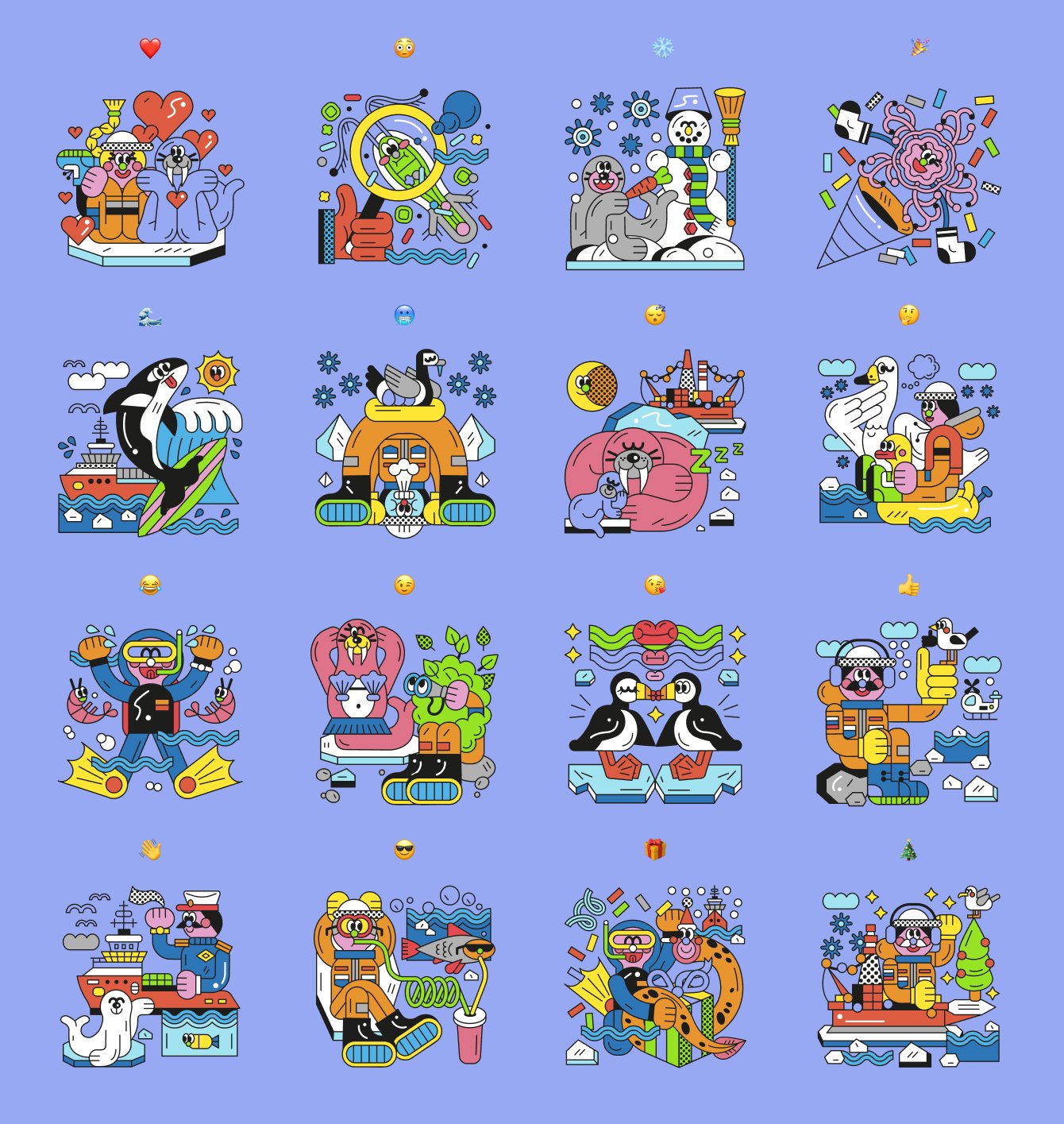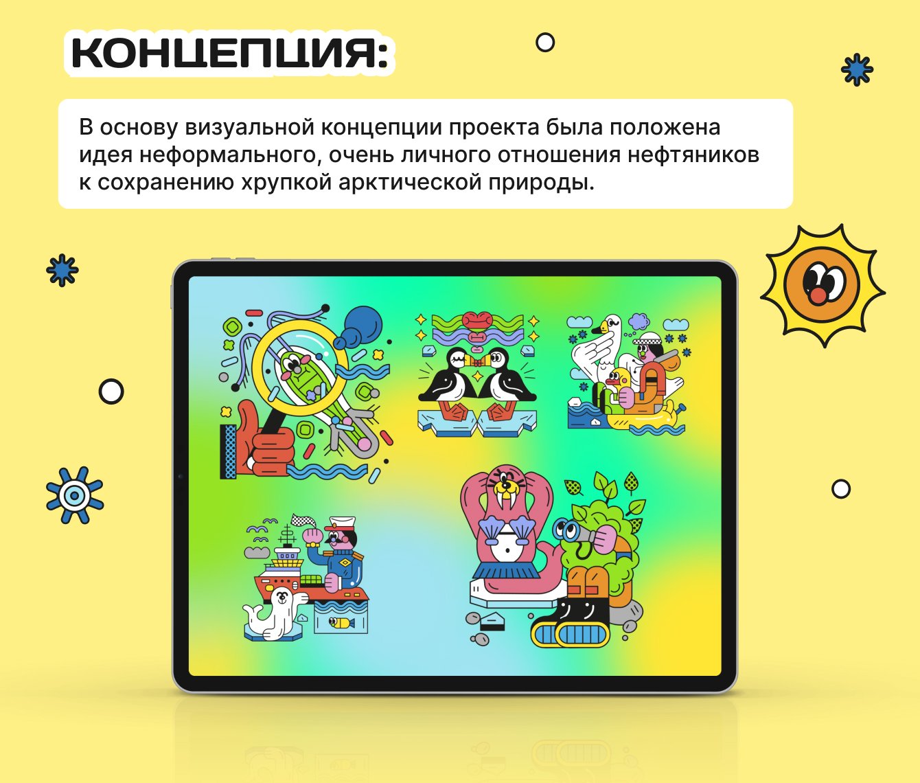 Разработка яркого и стильного стикерпака для Telegram, в основе сюжетов которого – безопасное соседство природы Арктики и вахтовиков, добывающих нефть на платформе «Приразломная».
