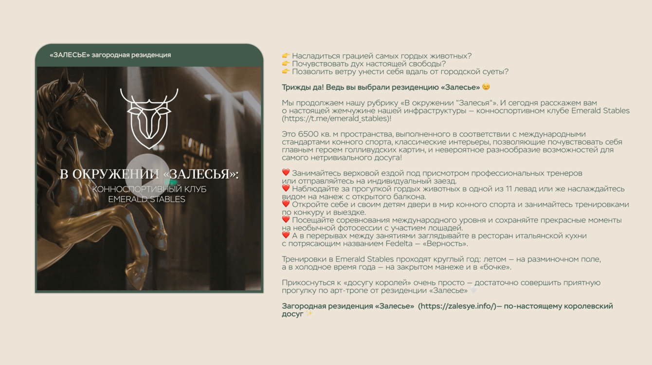 Мы рассказали о клубе Emerald Stables — жемчужине инфраструктуры «Залесья». Подробное описание возможностей включало: занятия конным спортом для детей и взрослых, участие в международных соревнованиях, а также фотосессии с лошадьми. Публикацию дополнили яркие фотографии с открытого урока и интервью с тренером.