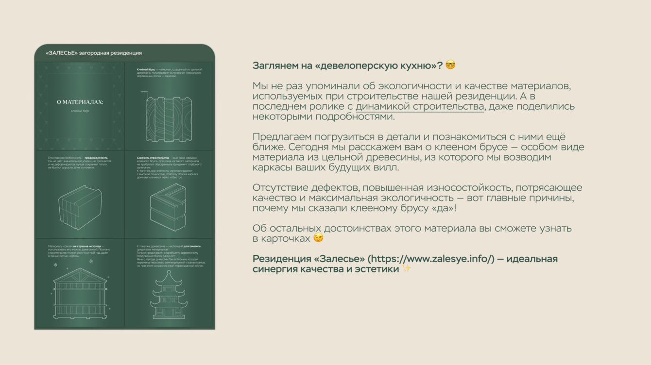 «Клеёный брус — прочность, экология, стиль». Это образовательный пост о клееном брусе — материале, используемом для строительства вилл. В рубрике об экологии и технологиях мы раскрыли его преимущества: экологичность, долговечность, устойчивость к деформации и уникальная эстетика, а также объяснили, почему выбрали этот материал для строительства вилл. На карточках подробно раскрывали этапы производства бруса, что вызвало интерес к технологии.