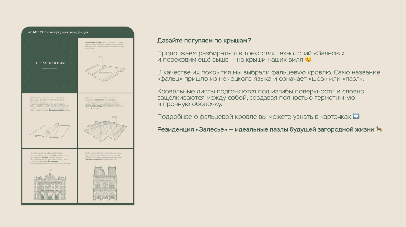 «Фальцевая кровля: красиво и надёжно». Мы подробно описали, почему эта технология используется в проекте. Упомянули её основные преимущества: отсутствие протечек, устойчивость к перепадам температуры и стильный внешний вид. Карточки включали примеры готовых крыш и советы по уходу за ними.