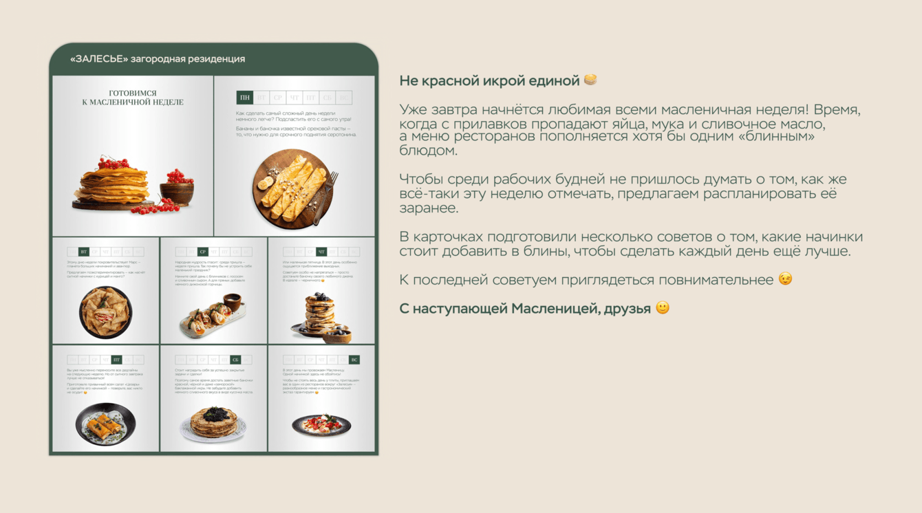 «Не красной икрой единой…». Для наших подписчиков мы подготовили советы по начинкам для блинов, которые можно попробовать на Масленичной неделе. Подборка в карточках привлекла внимание целевой аудитории благодаря лёгкому и праздничному тону. Карточки включали такие необычные начинки, как крем из маскарпоне с ягодами, козий сыр с мёдом и орехами, а также лосось с авокадо.