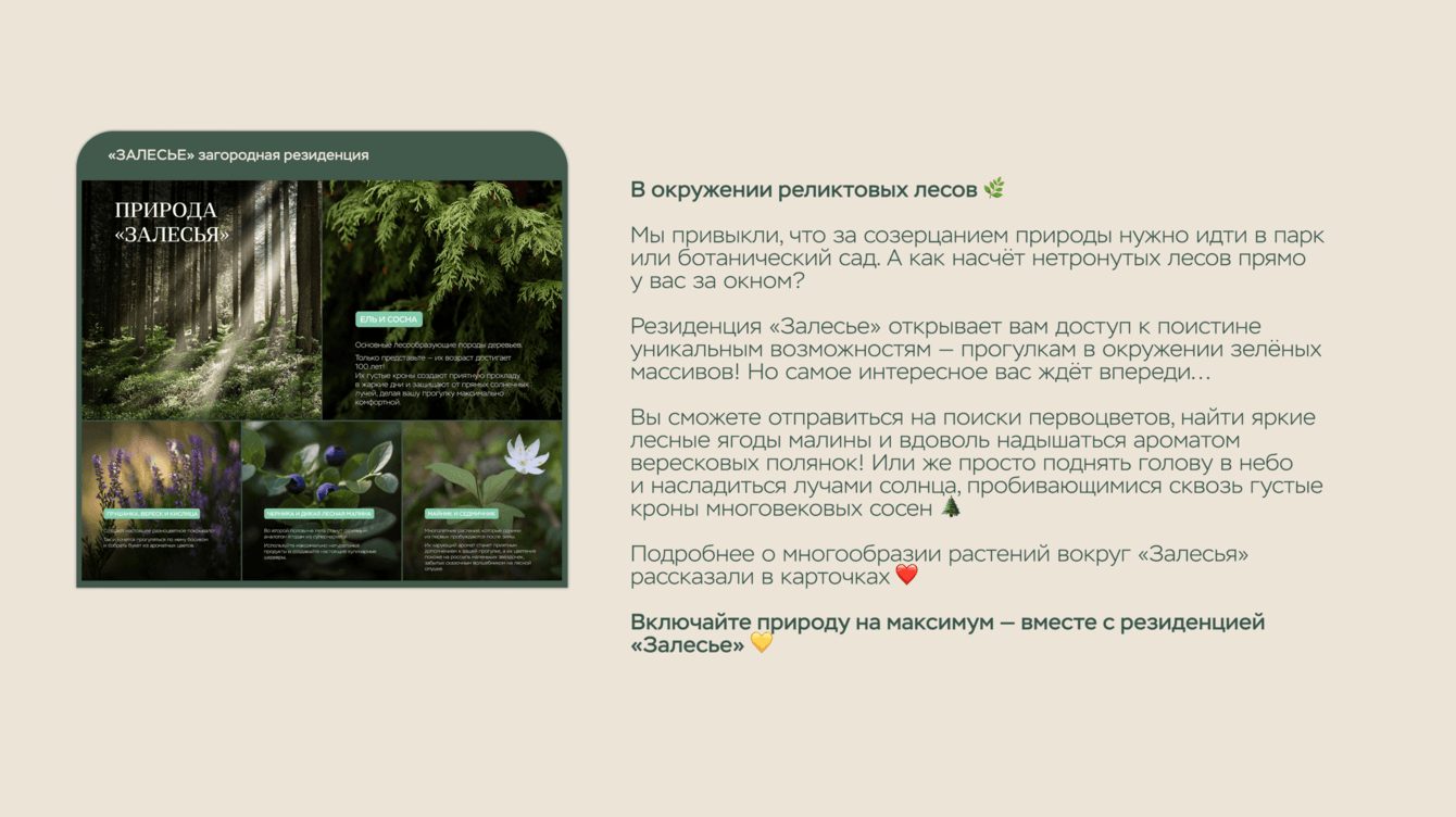 Мы органично отразили уникальность и премиальность проекта, избегая излишней вычурности. Акценты на камерности, экологичности и интеграции с природой позволили создать сильное позиционирование, которое выделяет «Залесье» среди конкурентов.