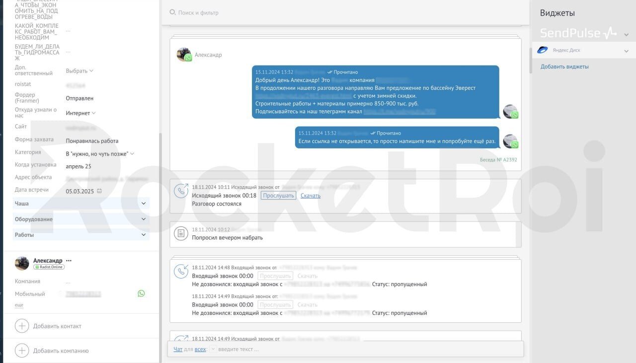 Благодаря автоматическому сохранению звонков и переписок, РОП в любой момент может зайти в сделку, переслушать разговоры и проверить, всё ли менеджер делает правильно.