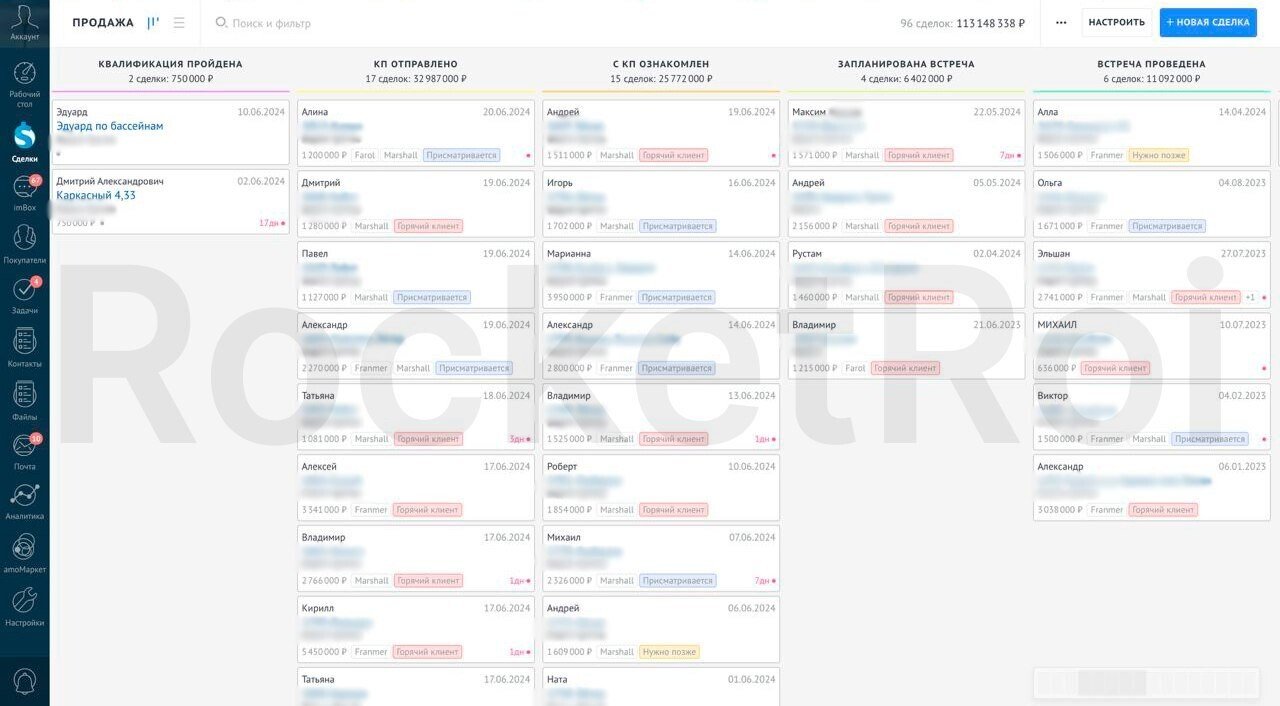 В сфере композитных бассейнов цикл сделки длинный – от первого обращения до покупки проходит от 2 недель до 3 месяцев, поэтому нам критически важно не терять контакт с клиентами и вовремя двигать их по воронке.