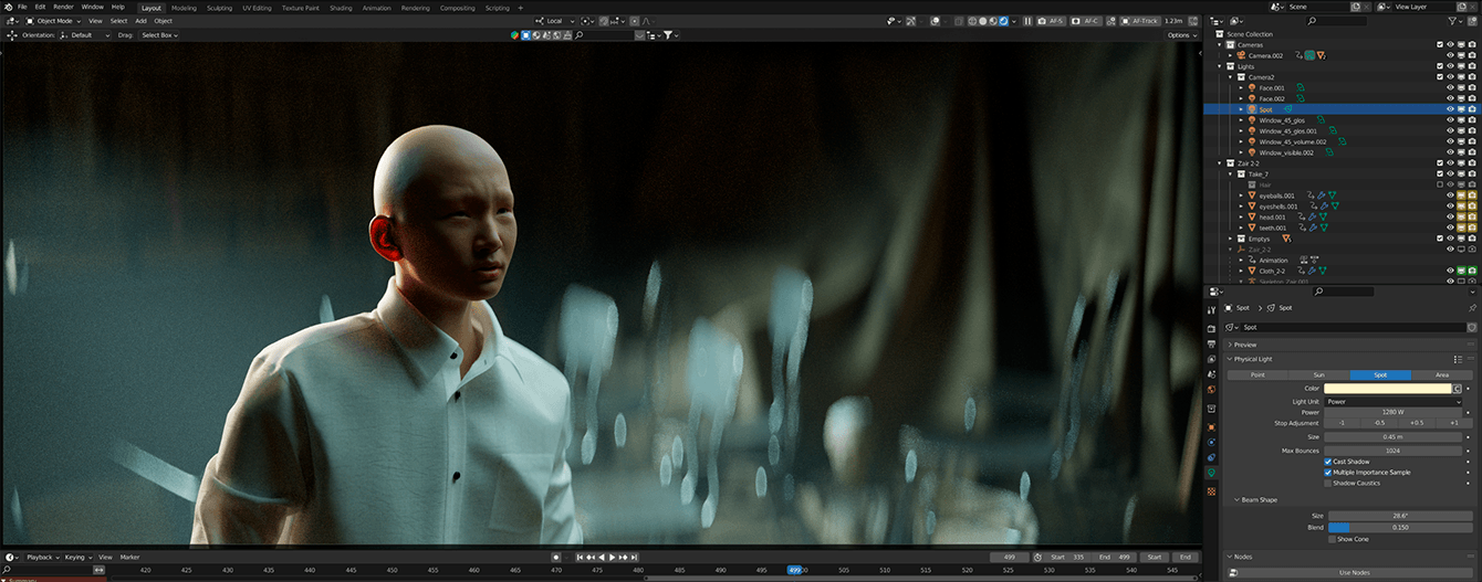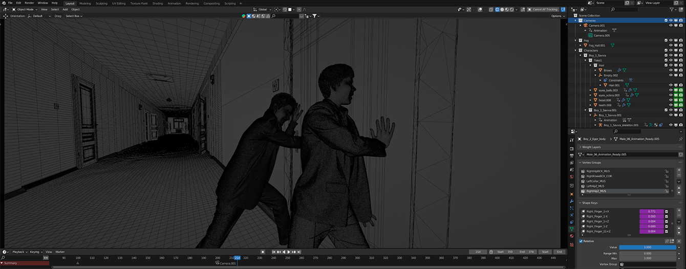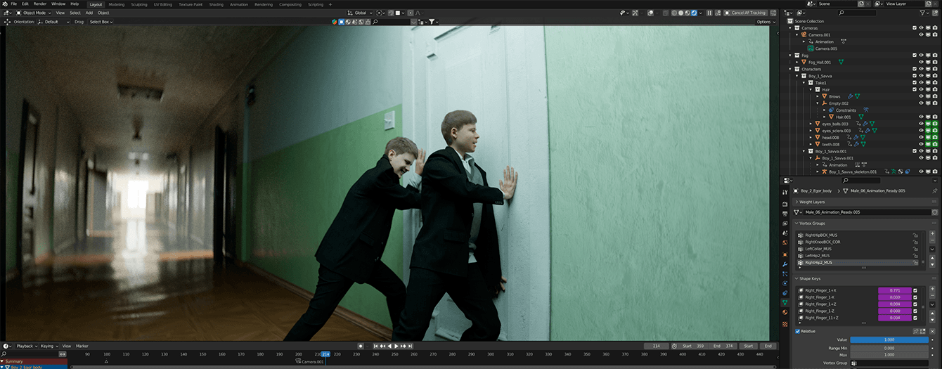 Анимация была полностью сделана в Blender. Лицевая анимация была записана с помощью шлема с двумя камерами для захвата 4D-анимации, после чего была обработана в Wrap4D.