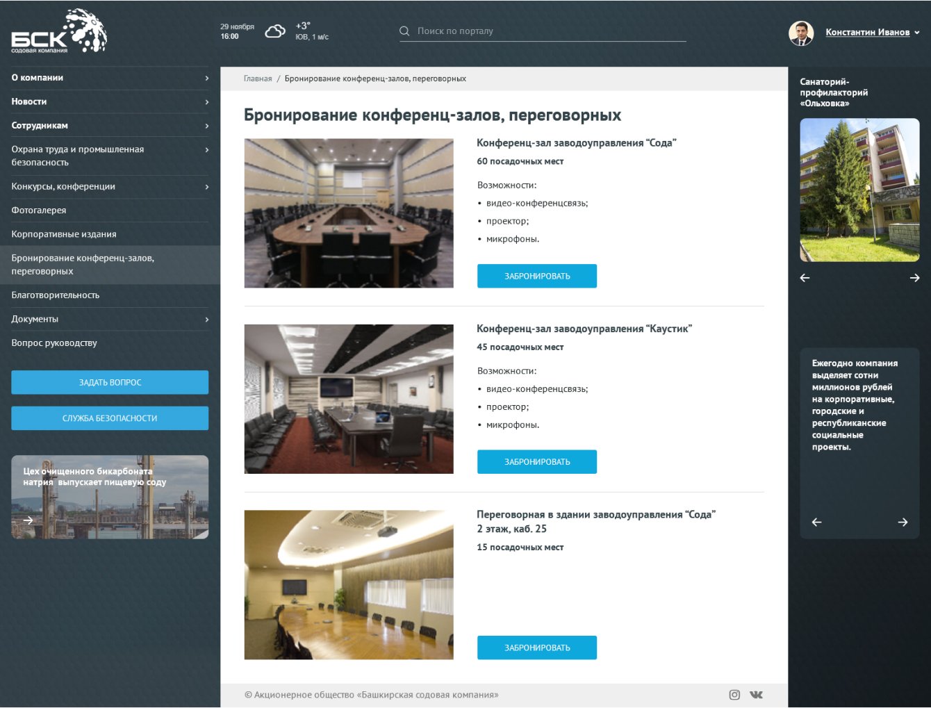 Позволяет сотрудникам БСК бронировать свободные переговорные комнаты. Также реализована возможность создания новых переговорных комнат и мониторинга их занятости
