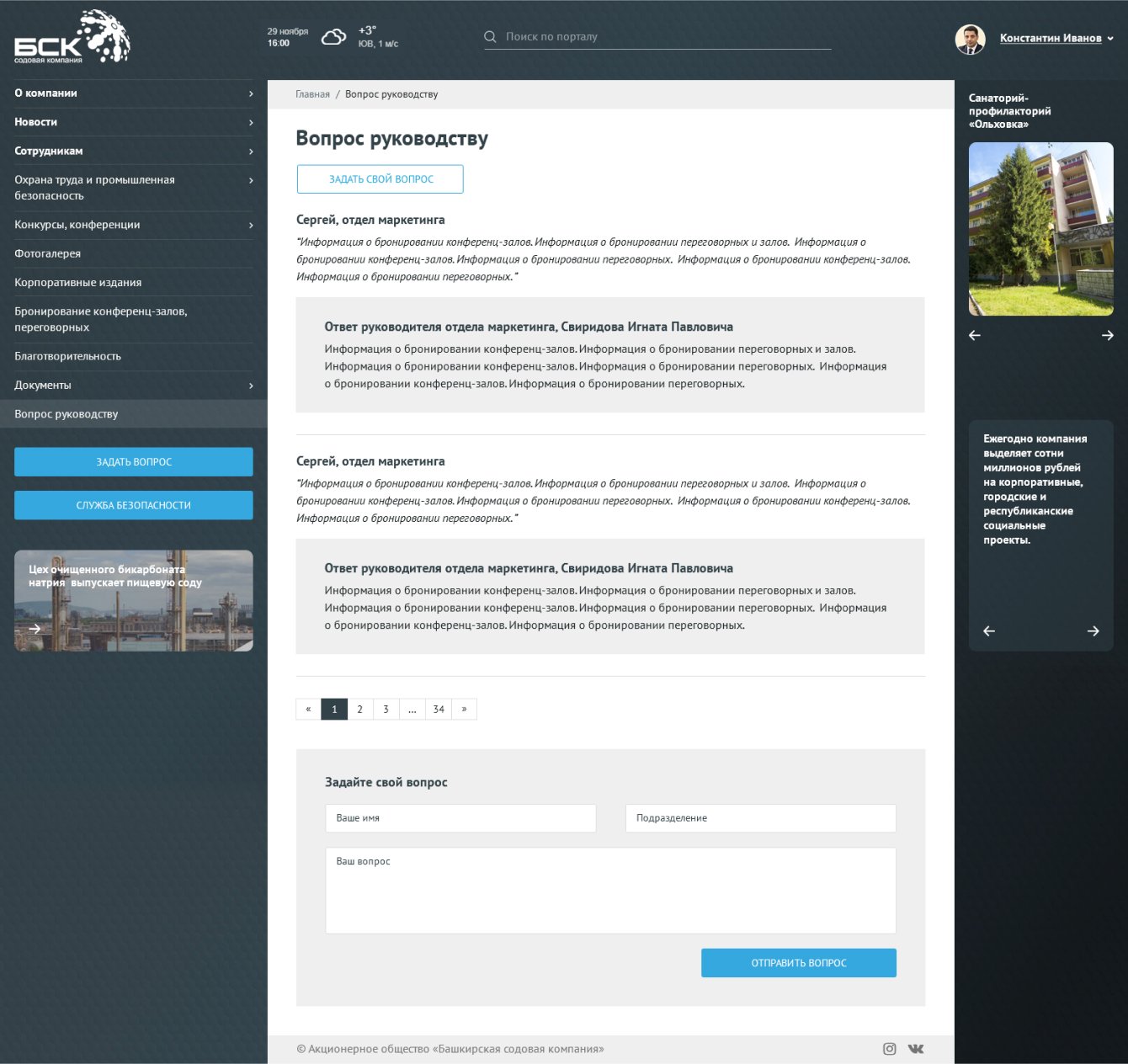 Раздел с вопросами и ответами от руководства компании. Задать вопрос может каждый сотрудник компании