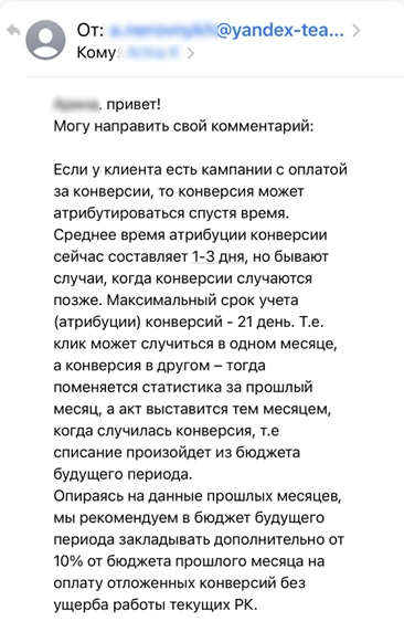Яндекс утверждает, что на «доходящие конверсии» может потратить не более 10% расхода прошлого месяца. А так как расходы за июнь у нас были значительно больше, чем в остальные месяцы, то заметили мы это только в июле, когда бюджета было уже намного меньше.